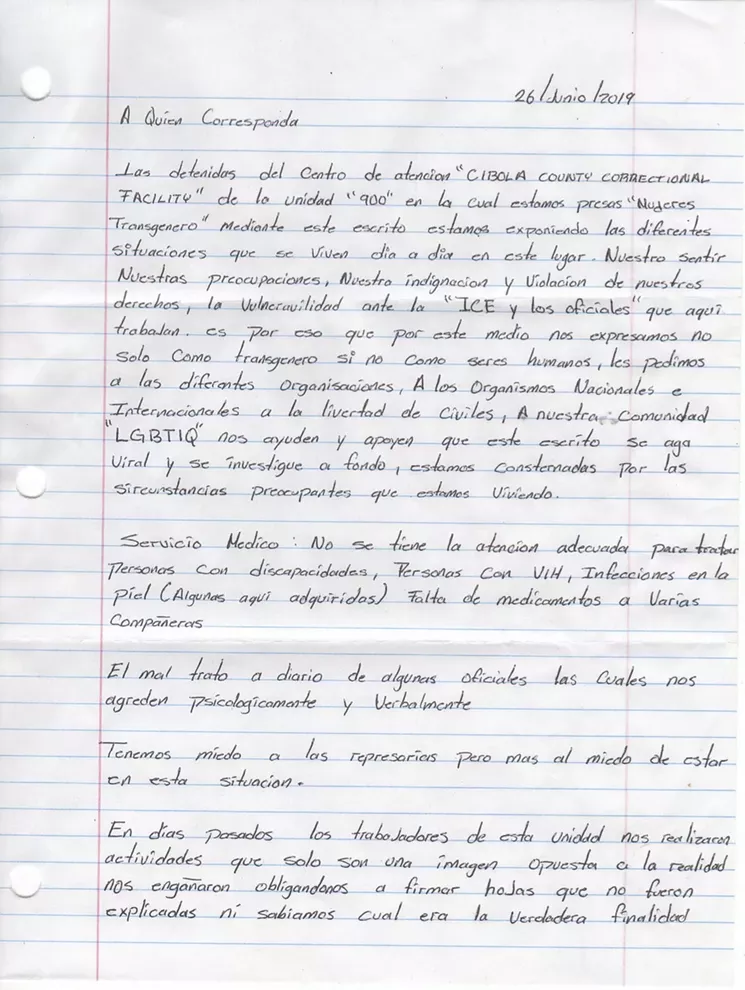 Members of Trans Queer Pueblo, a Phoenix-based advocacy group run by LGBTQ migrants of color, received a letter outlining some of the complaints in late June addressed from transgender and gender nonbinary inmates at the Cibola County Correctional Center in New Mexico.