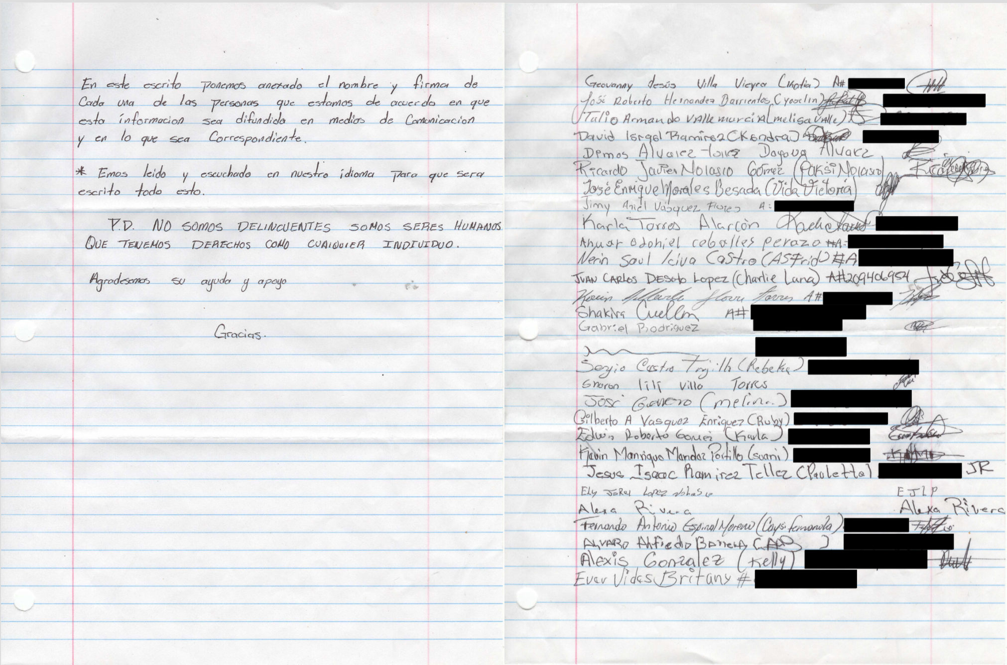 The 29 migrant detainees from Cibola, who signed with their full names and identifying “A-numbers,” ask for the national and international human rights community to launch an official investigation into the facility.