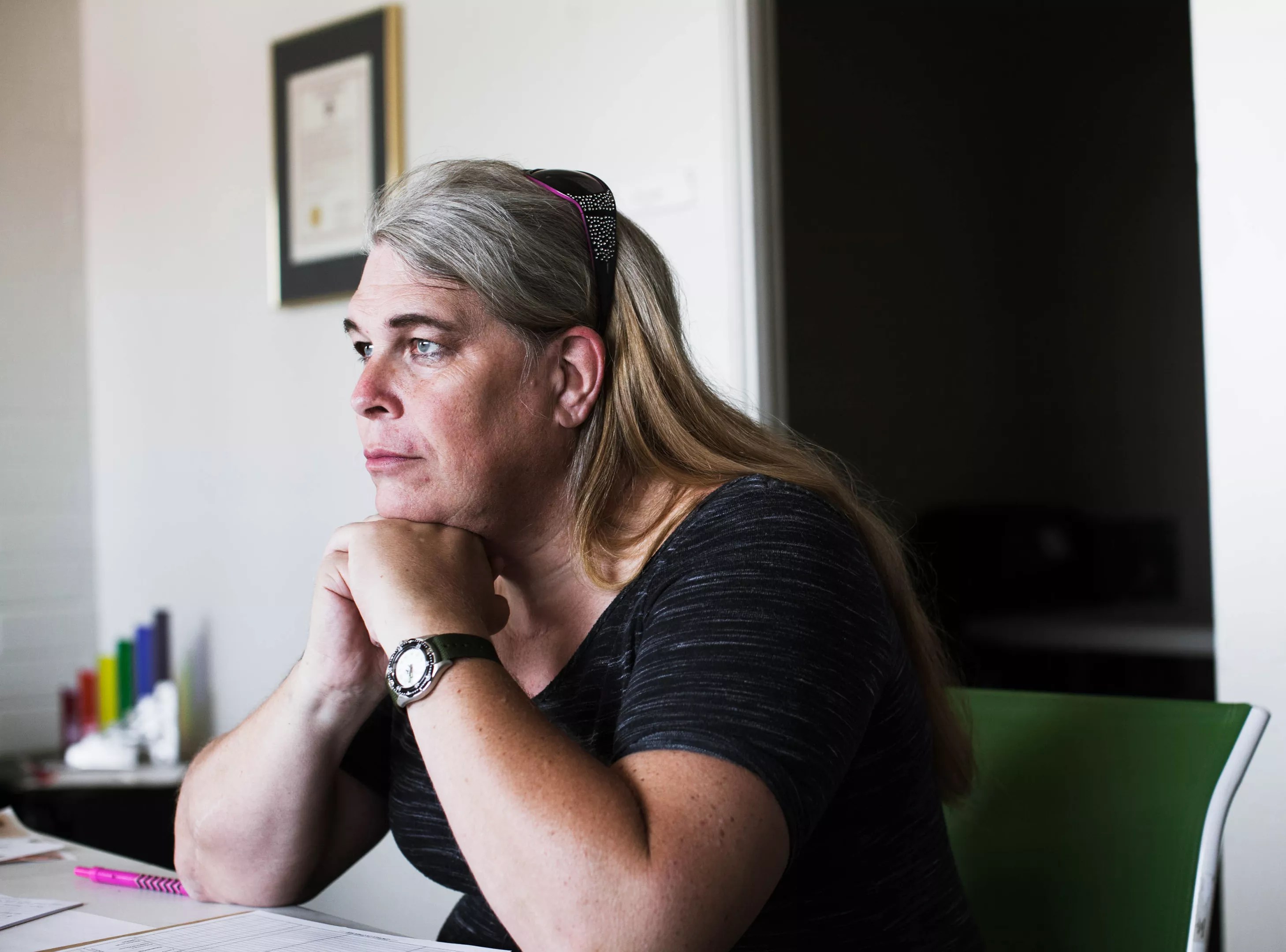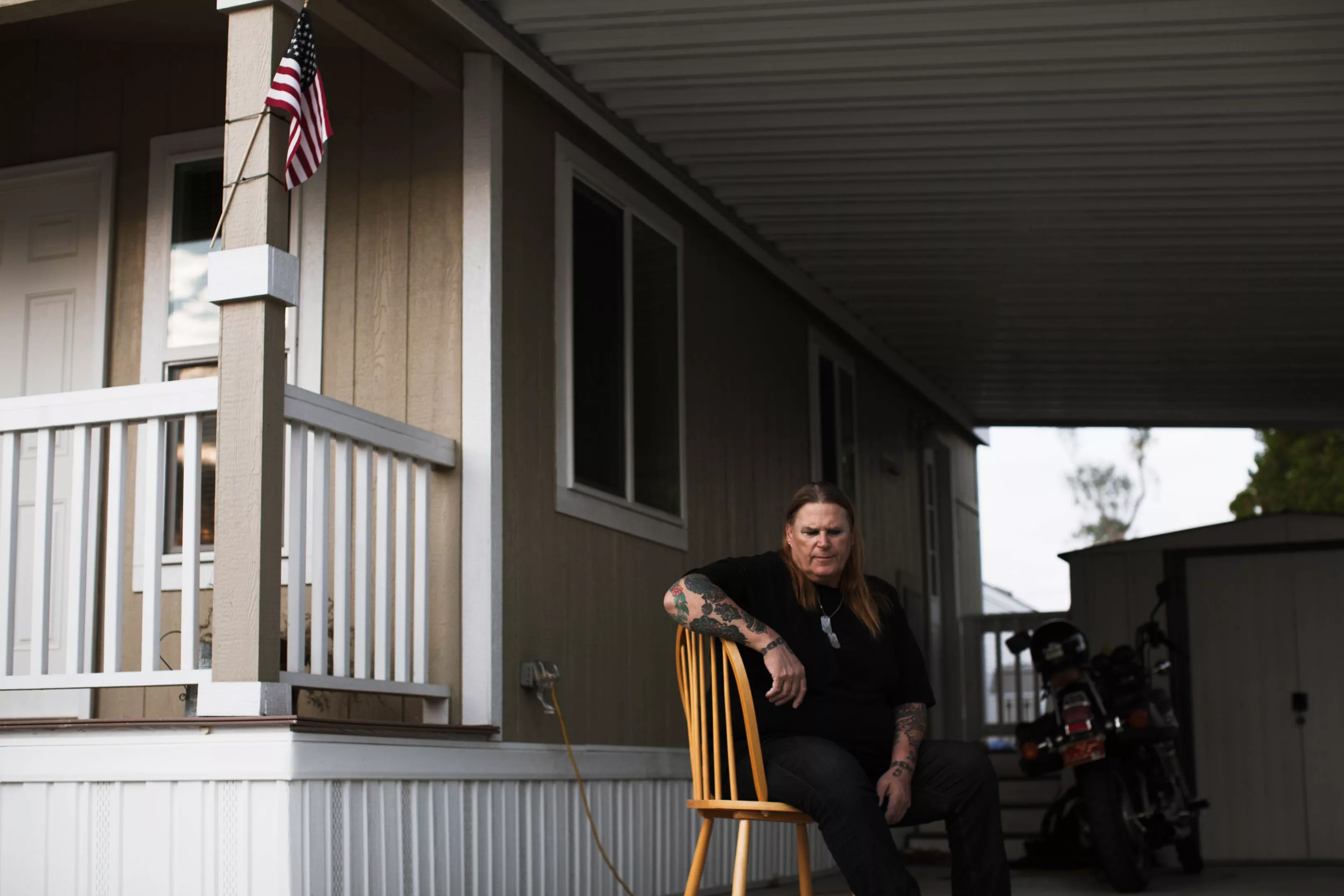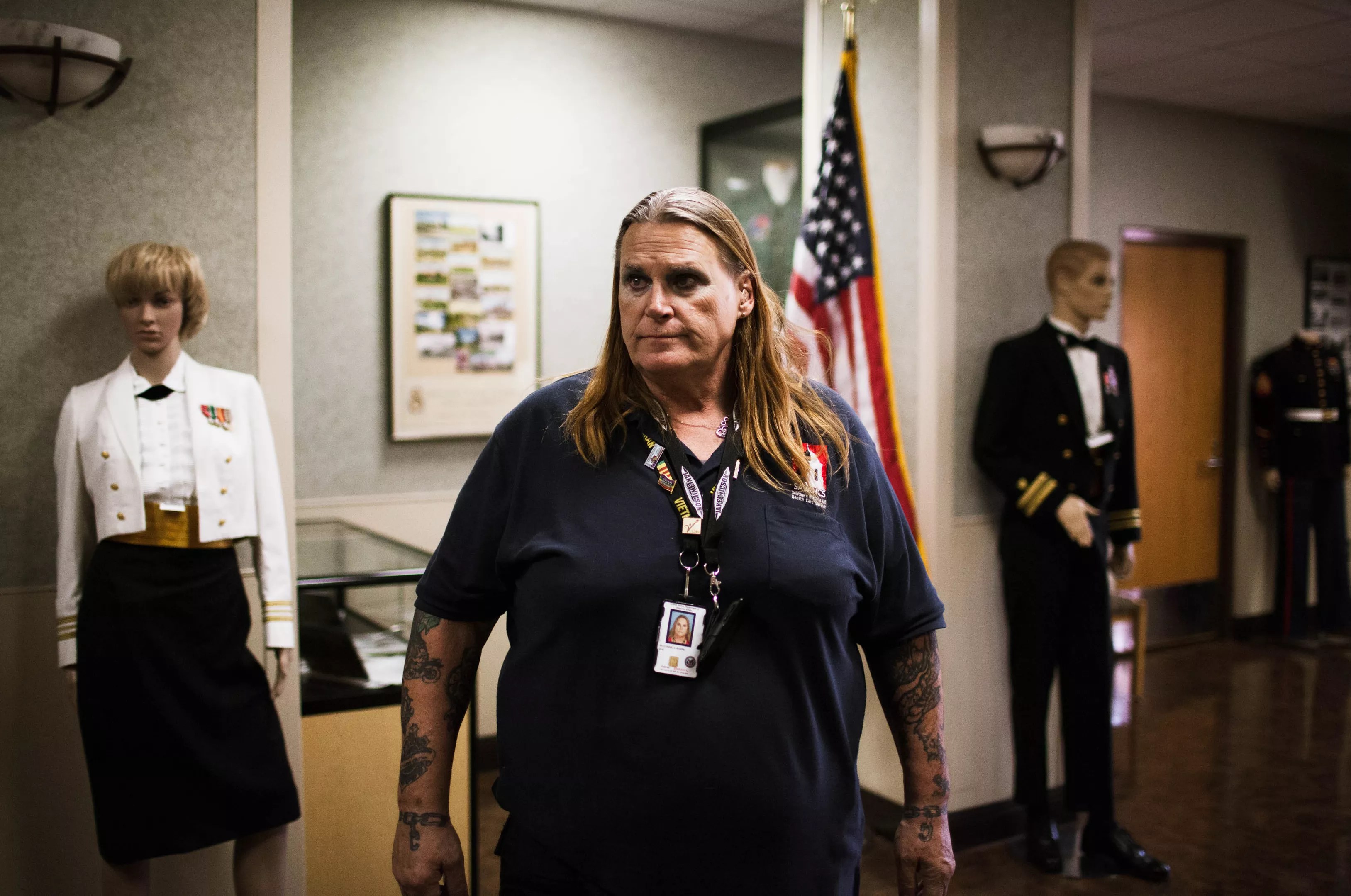 She sits with other gender nonconforming veterans for a transgender support group.