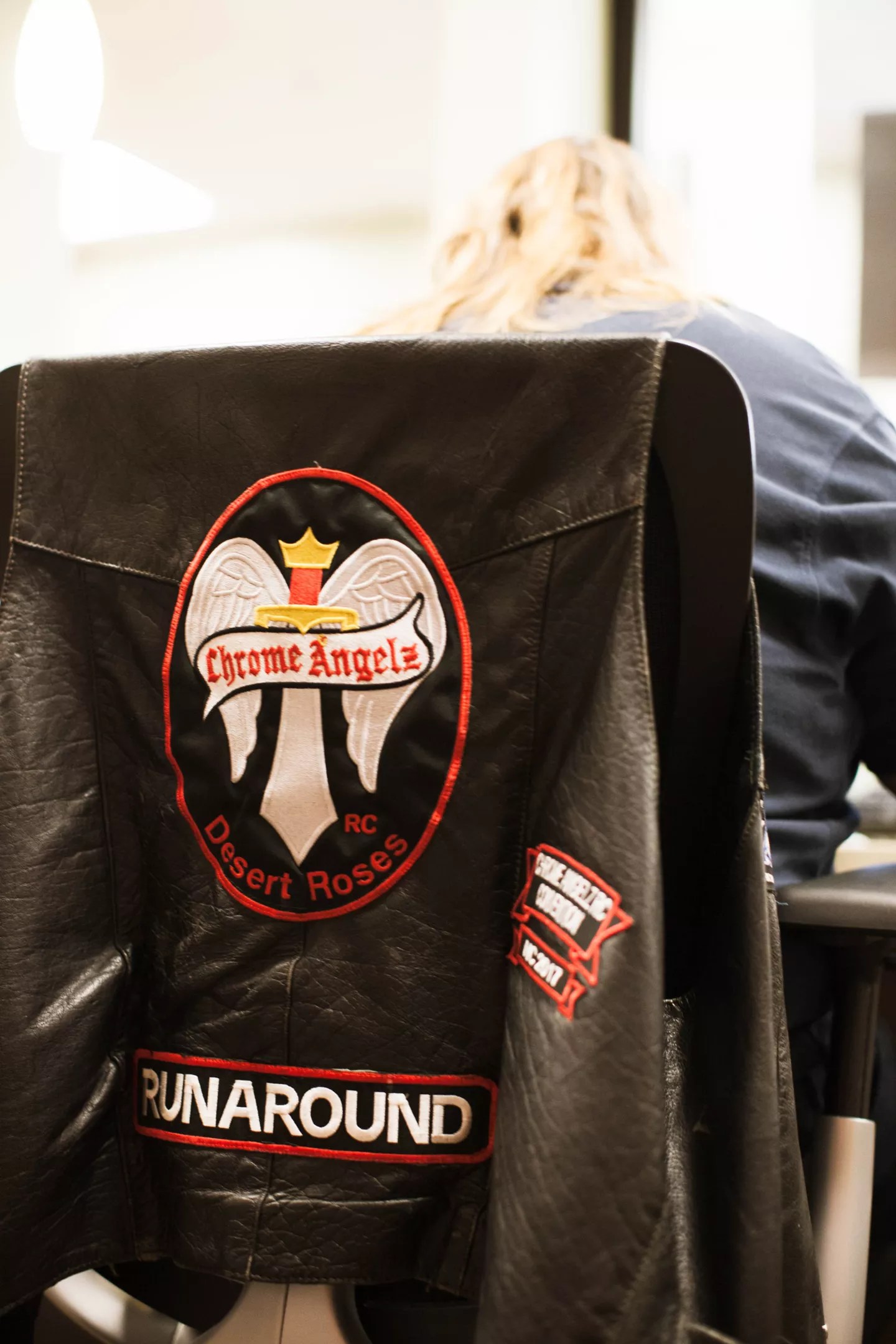 McConnell, a member of the all-female biker group, the Chrome Angels, dresses “for the slide, not the ride.” Her leather jacket sits on the back of her chair as she volunteers at the VA.