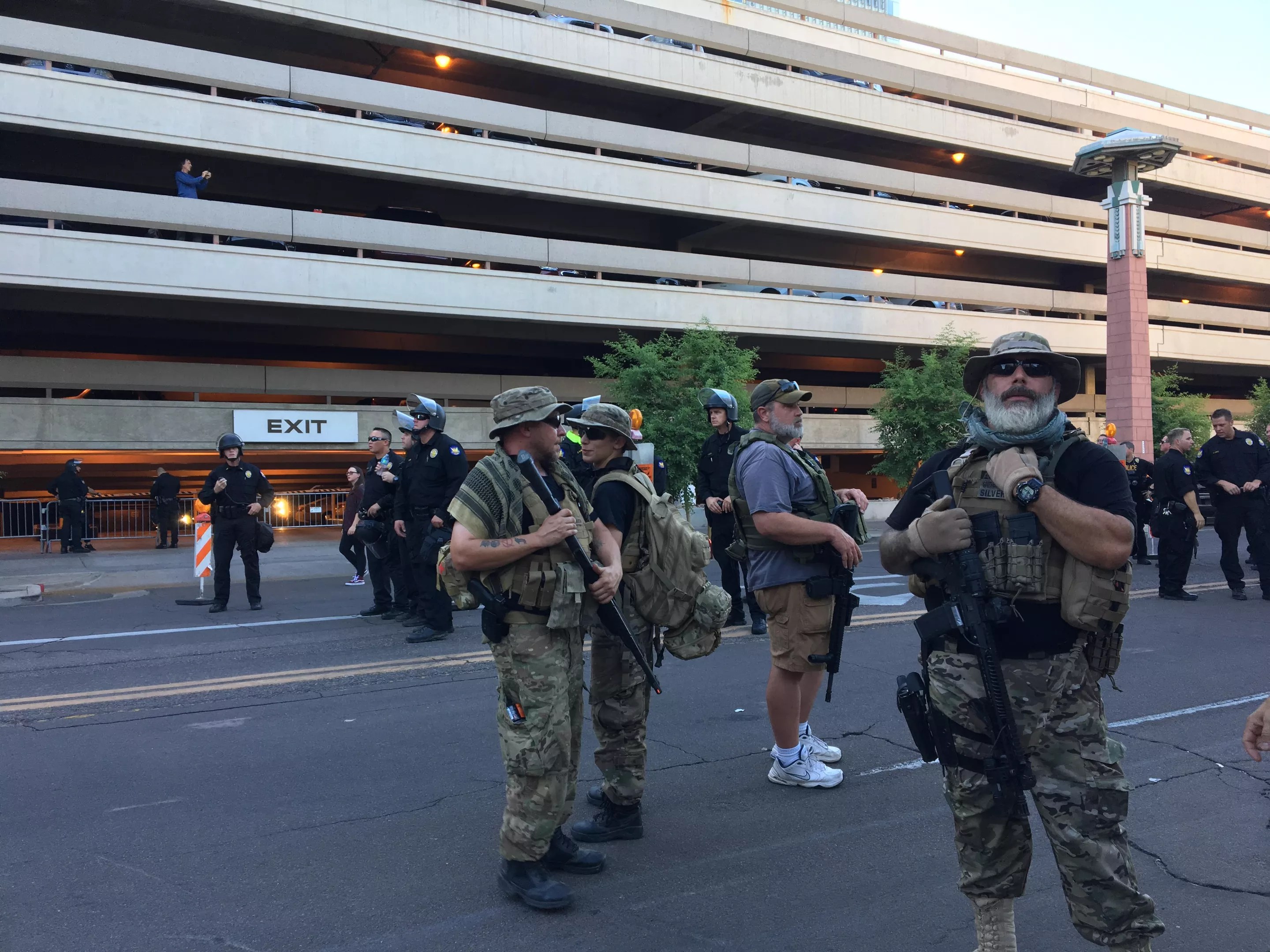 Earlier, demonstrators had been asking questions of the men: Why they were at the protest? “I don’t know why they’re trying to razz us,” the bulky militia member said. As for identification, he refused to give a name and only offered that he was a “citizen of the great state of Arizona.”