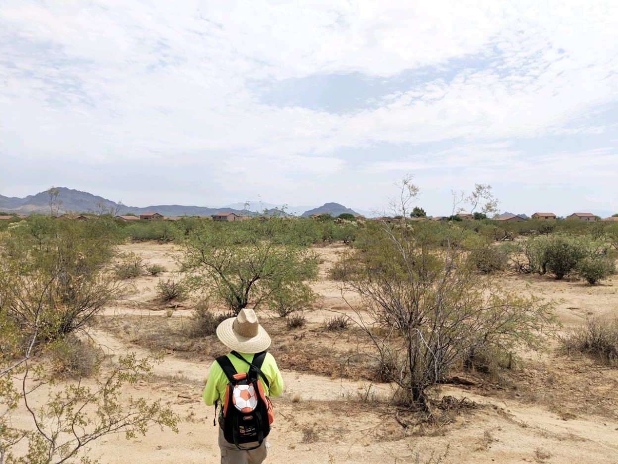 A volunteer combs the desert near a Tucson housing development off State Highway 86.