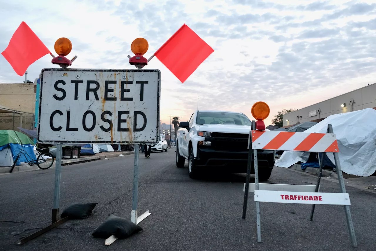 Friday’s sweep was a “pilot,” city staff told Phoenix New Times. Only one block, Madison Street between 12th and 13th avenues, was cleaned. The vast majority of tents in the Zone were left alone. So were the giant dinosaurs that appeared recently.