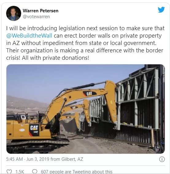 “I will be introducing legislation next session to make sure that @WeBuildtheWall can erect border walls on private property in AZ without impediment from state or local government,” Petersen tweeted in June 2019, three months after Hodai’s article exposed the group as a possible fraud. “Their organization is making a real difference with the border crisis! All with private donations.”