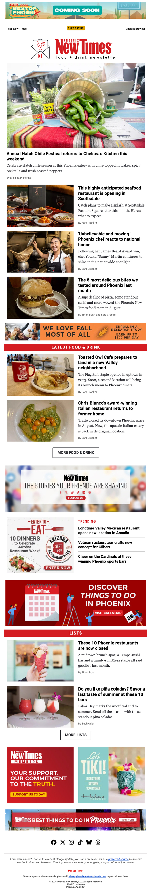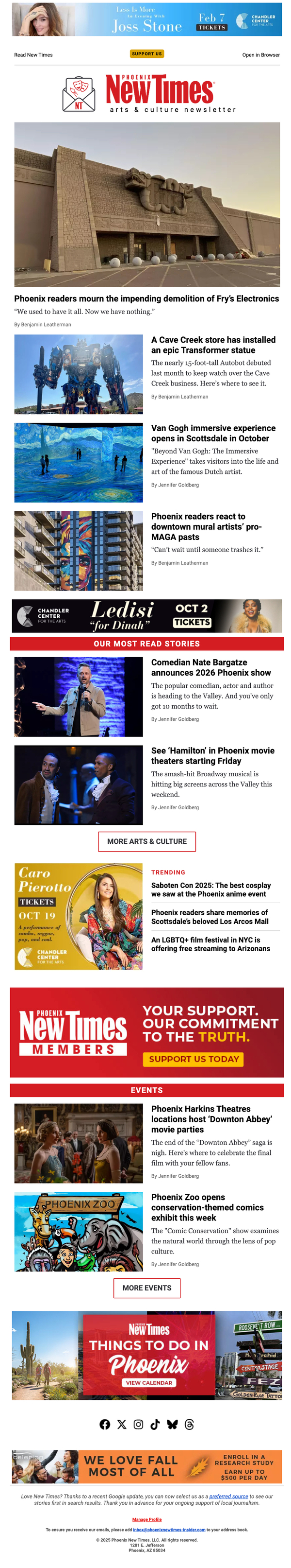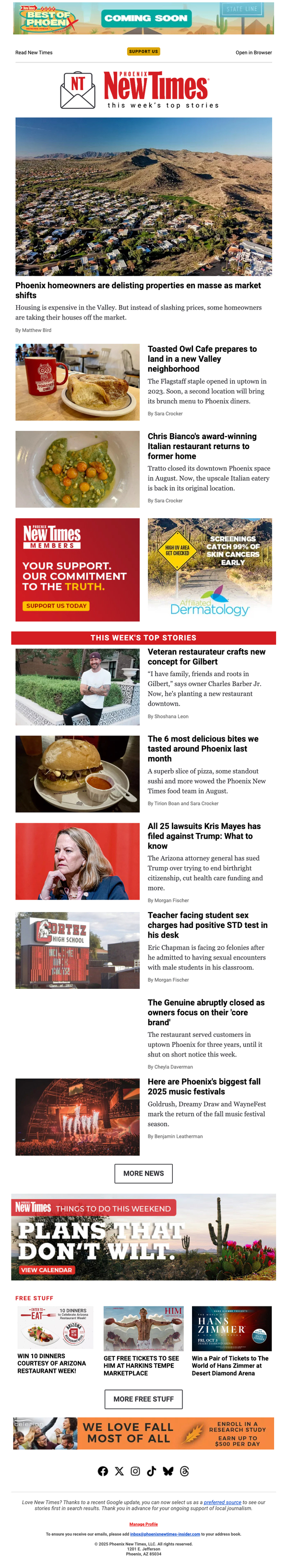 Stay informed with our daily digest of the most popular news, music, food and arts stories in Phoenix. Delivered every morning Monday through Friday.