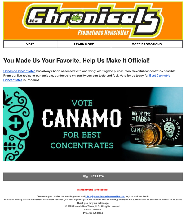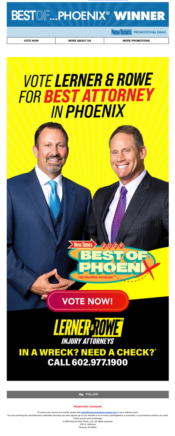 Stay informed about our Best of Phoenix® winners with promotional offers and announcements from past and present title-holders. Delivered as needed Monday, Wednesday, and Friday. Once a month, we’ll also send you an editorial edition of this newsletter.