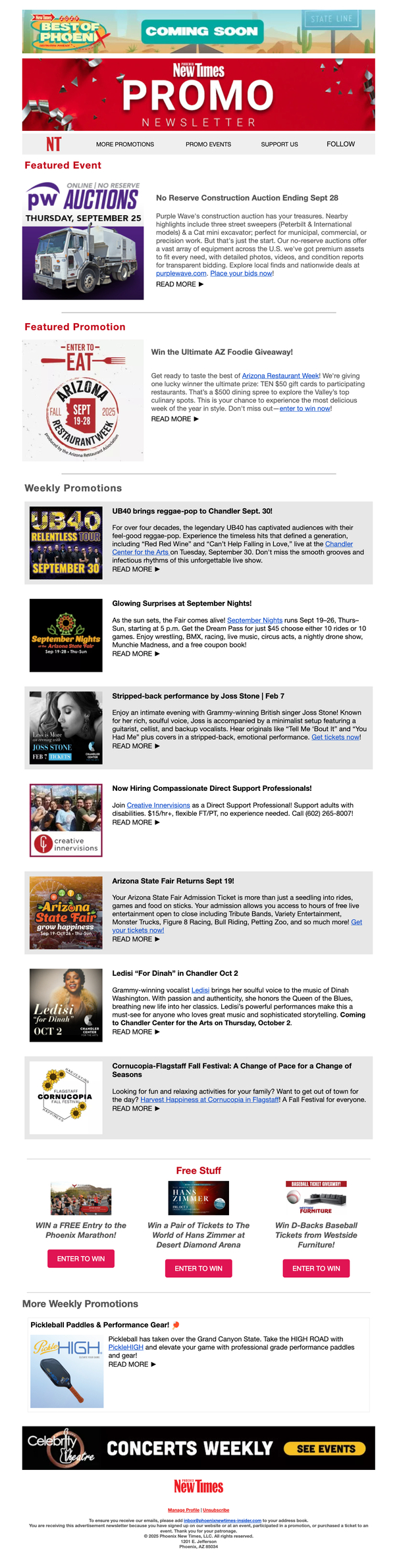 Get access to VIP events, free tickets, prize packages, and special offers available exclusively to our email subscribers. Delivered as needed Monday through Friday.