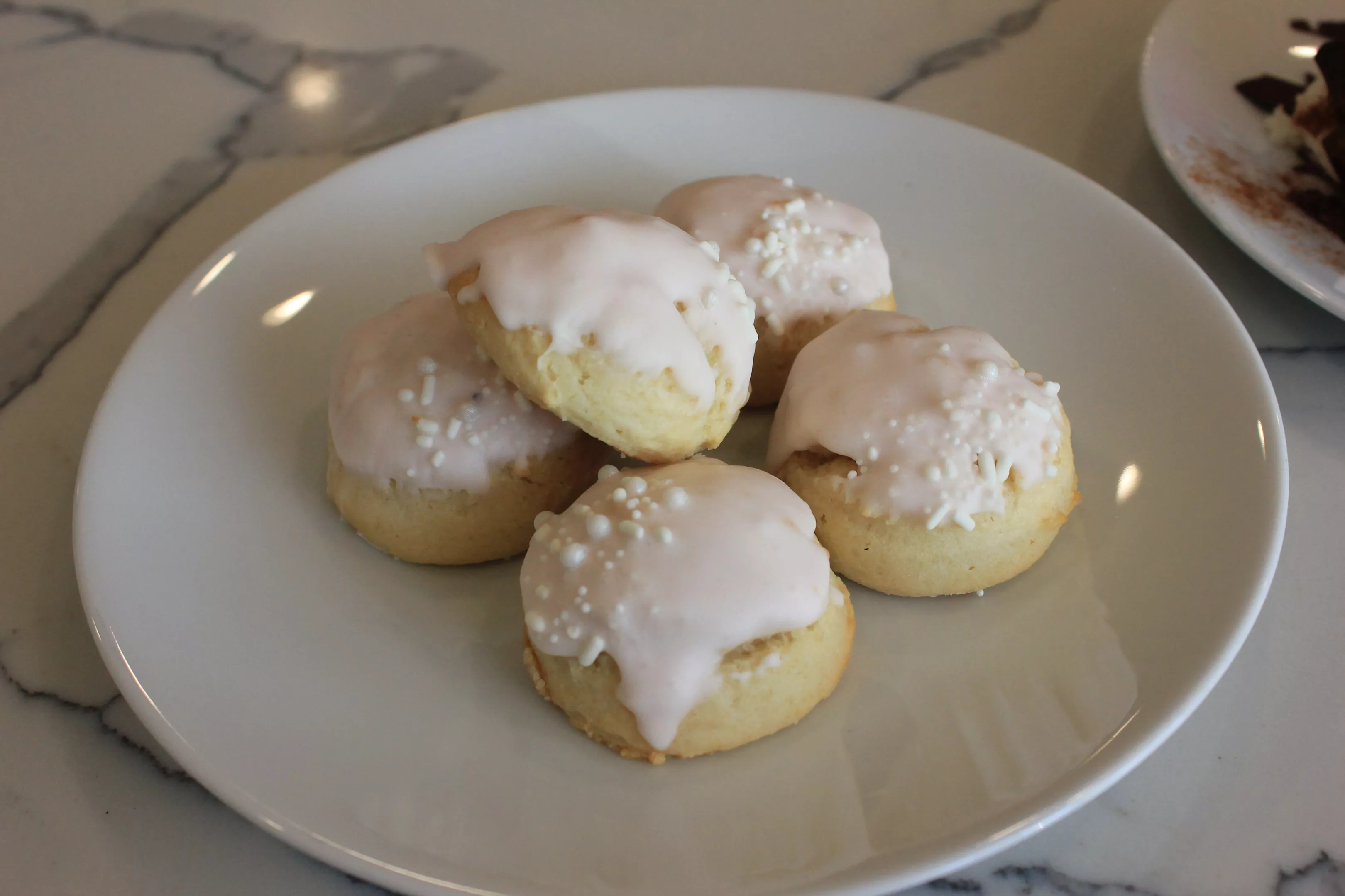 Tuck’s two-bite ricotta cookies, smeared with vanilla icing and sprinkled, are puffy and light from use of the cheese. The cookie is barely sweet. She typically shoots for pastries “not too sweet, so people can actually finish the whole dessert.”