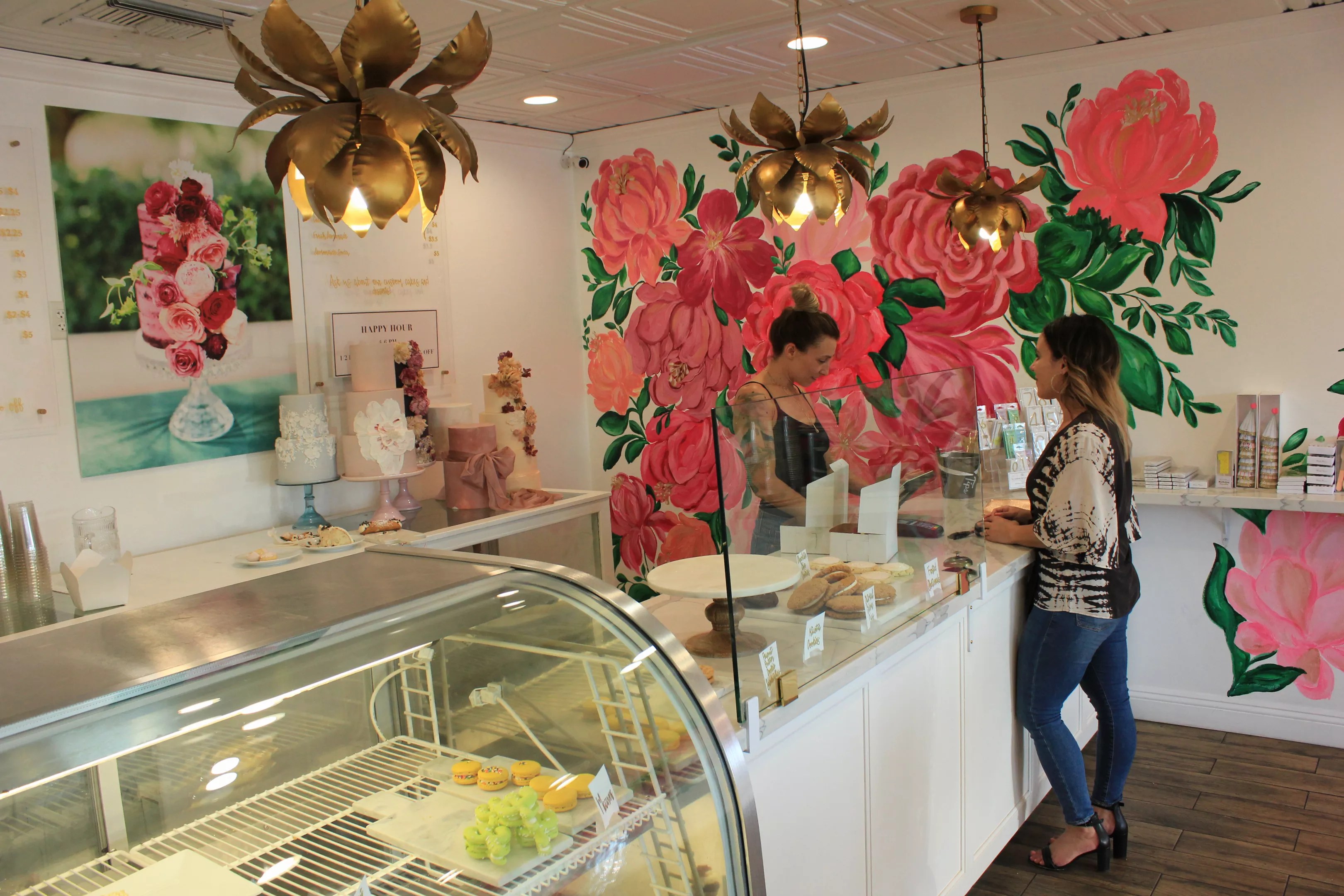 A Bakeshop hovers in a zone between Sicilian, American, and, most of all, new age. A plush, pink-cushioned couch stands beyond ornate tabletops that recall the marble of high-end Italian pastry shops. The colors are minimalist white, broken on one wall by a trail of outsize painted flowers. The vibe reflects the pastries; the pastries reflect Tuck’s style: simple, light, low sweetness, Old World meets New.