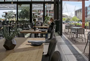In a cavernous room where the sound seems to vanish overhead, blond wood accents a sea of white and daylight pours in through floor-to-ceiling windows. They reveal the edifices of Arizona State University’s SkySong campus, curling around Fellow’s posh patio, and the strip of garden where begonias grow. Italy couldn’t feel more remote.