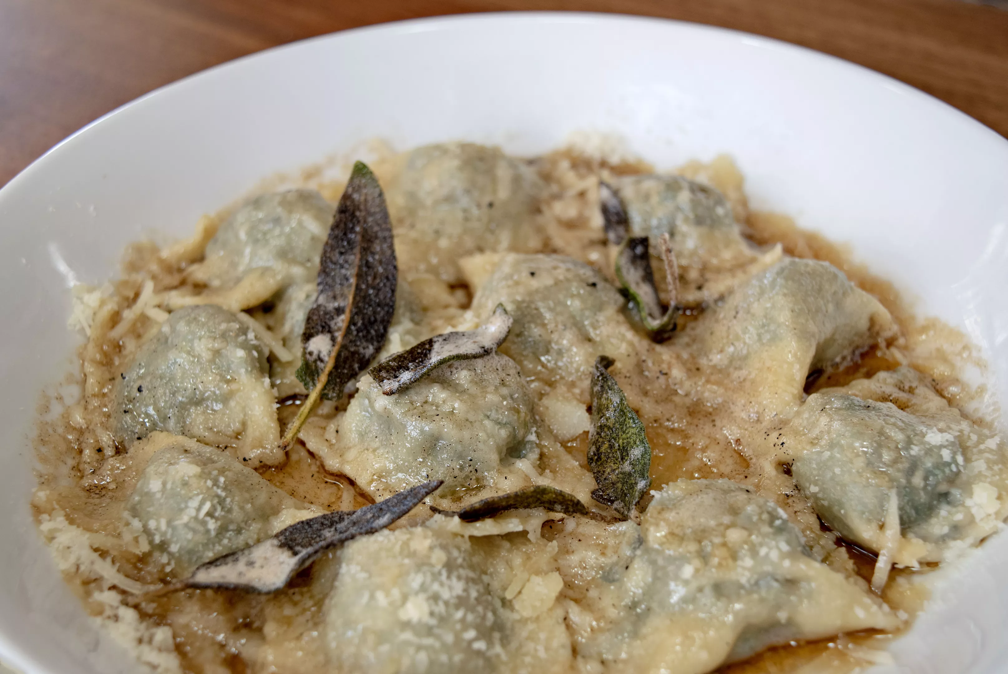 A close up of the Swiss chard ravioli at Fellow.