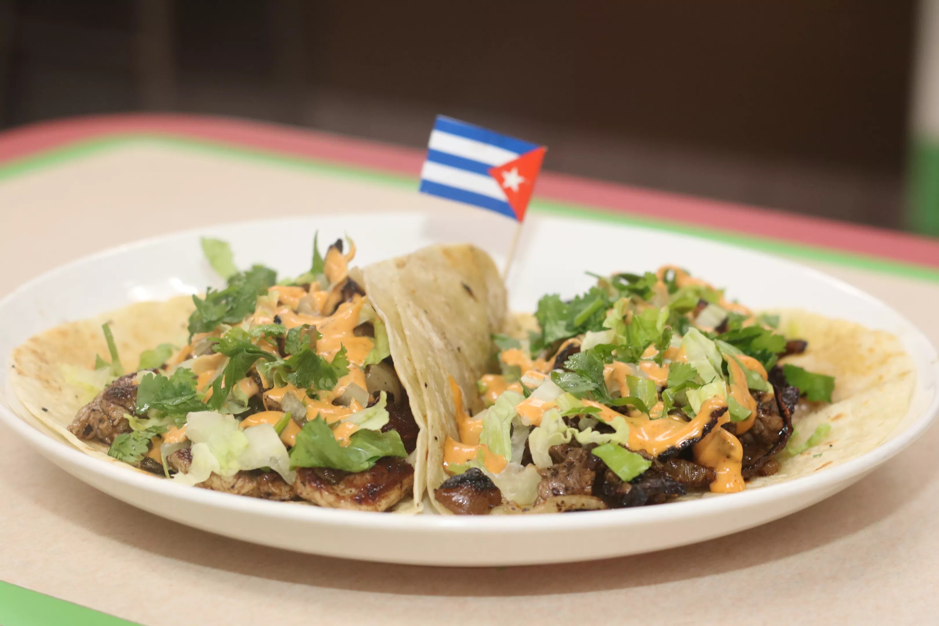 Cuban tacos are larger than typical Mexican street tacos. They are served on six-inch tortillas and stuffed with steak, chicken, or ropa vieja. The tacos are topped with cilantro, lettuce, and house-made chipotle mayo sauce. The savory and hearty Cuban tacos run $4 apiece.