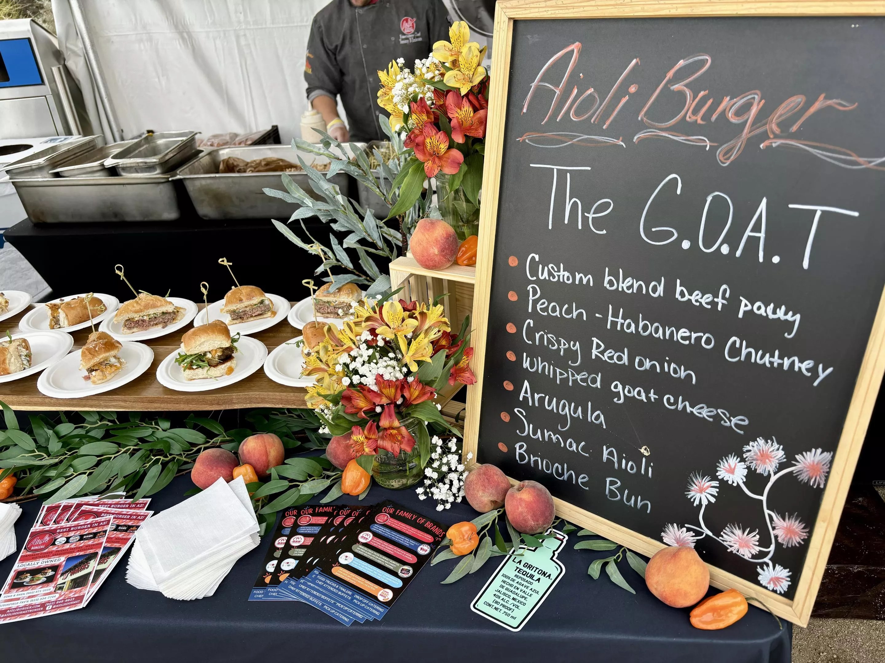 Aioli Burger served sliders topped with a spicy and sweet chutney and creamy whipped goat cheese.