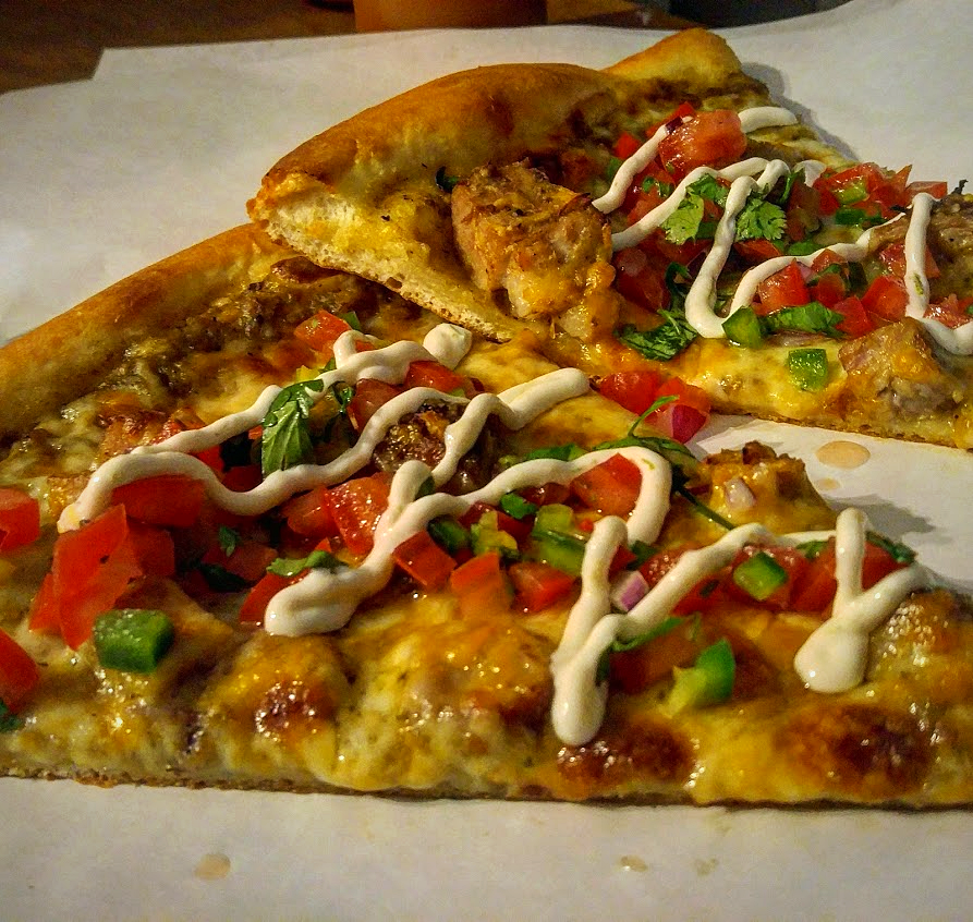 And the pizza’s pretty damn good. The slices are foldable, New York-style slices with pleasingly chewy crusts and a lovely house-made red sauce that’s neither too sweet or acidic. There are a number of notable specialty pies on the menu, including the saucy Rizzo, which is embedded with spicy sausage, mushrooms, roasted garlic, fresh basil, melty dollops of ricotta, and extra red sauce.