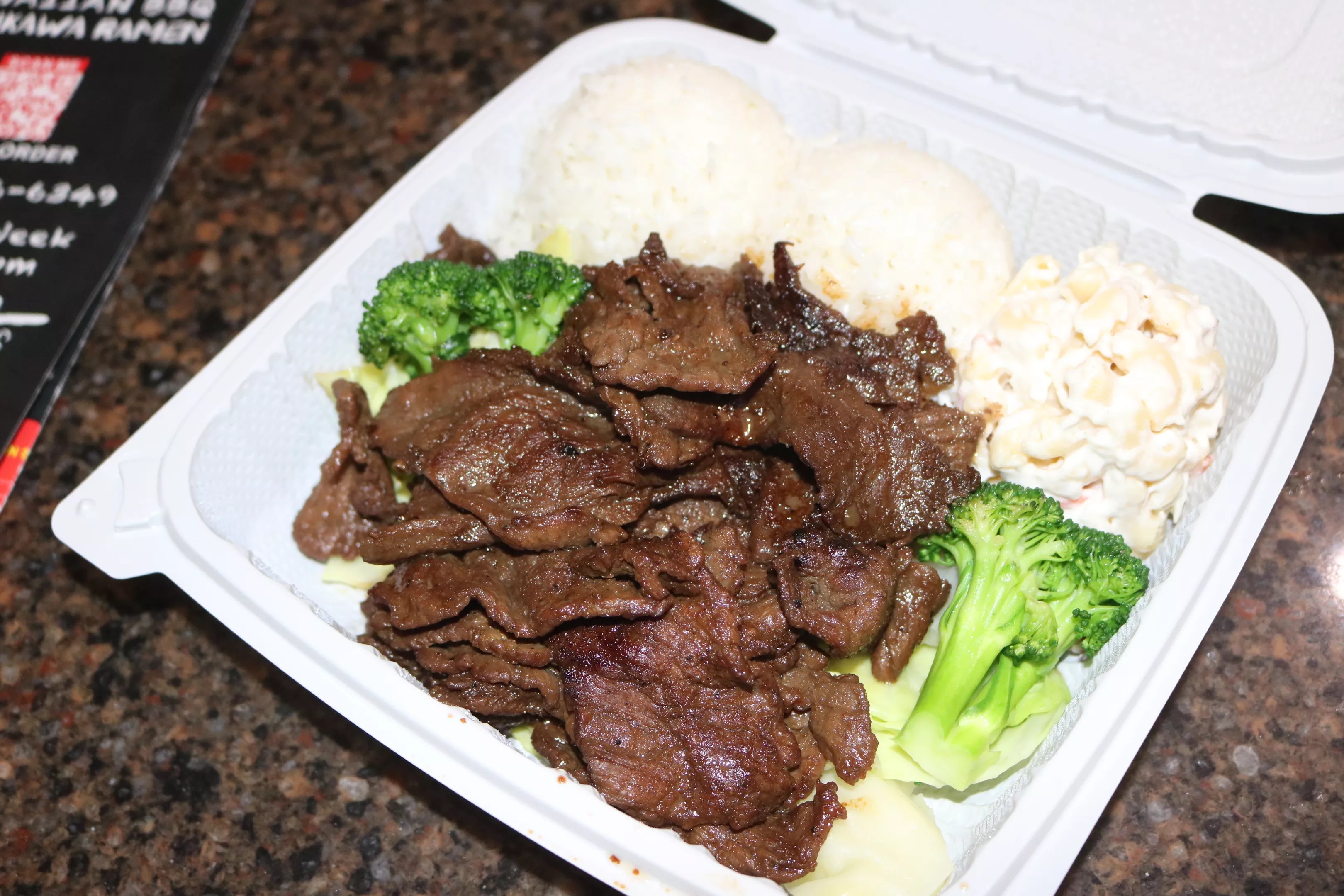 A plate lunch with two or more entrées is called a mixed plate in Hawaii. At Hawaiian BBQ Nishikawa Ramen, it’s called a Hawaiian Favorite.