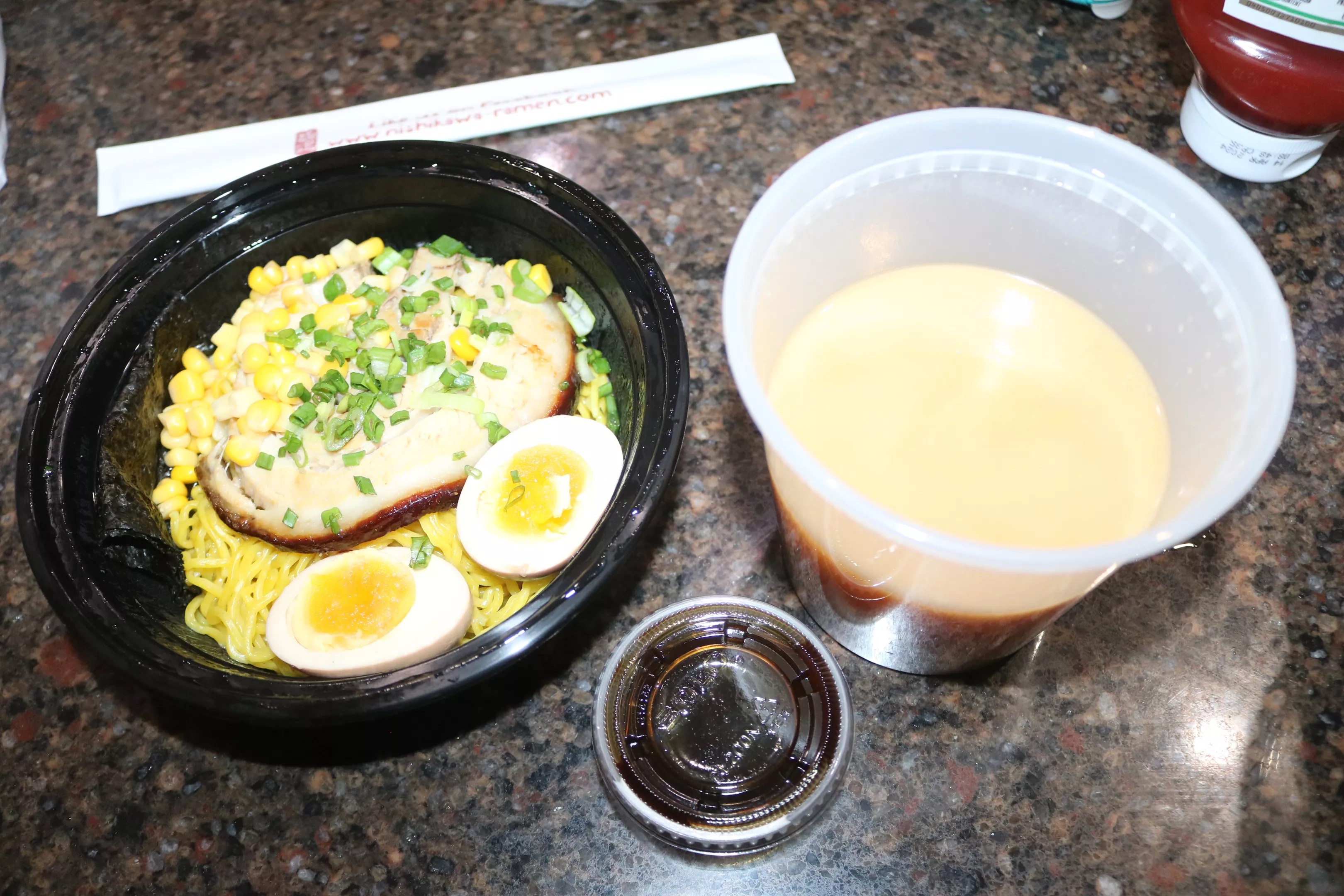 Another creative combination is the kimchi ramen, which includes a mix of Japanese ramen with chashu or braised pork and kimchi. The large bowl of soup is served with pork broth, corn, sesame seeds, green onion, kimchi, curved noodles and a seasoned egg, which can come boiled or fried sunny side up. The restaurant serves 10 different types of ramen.