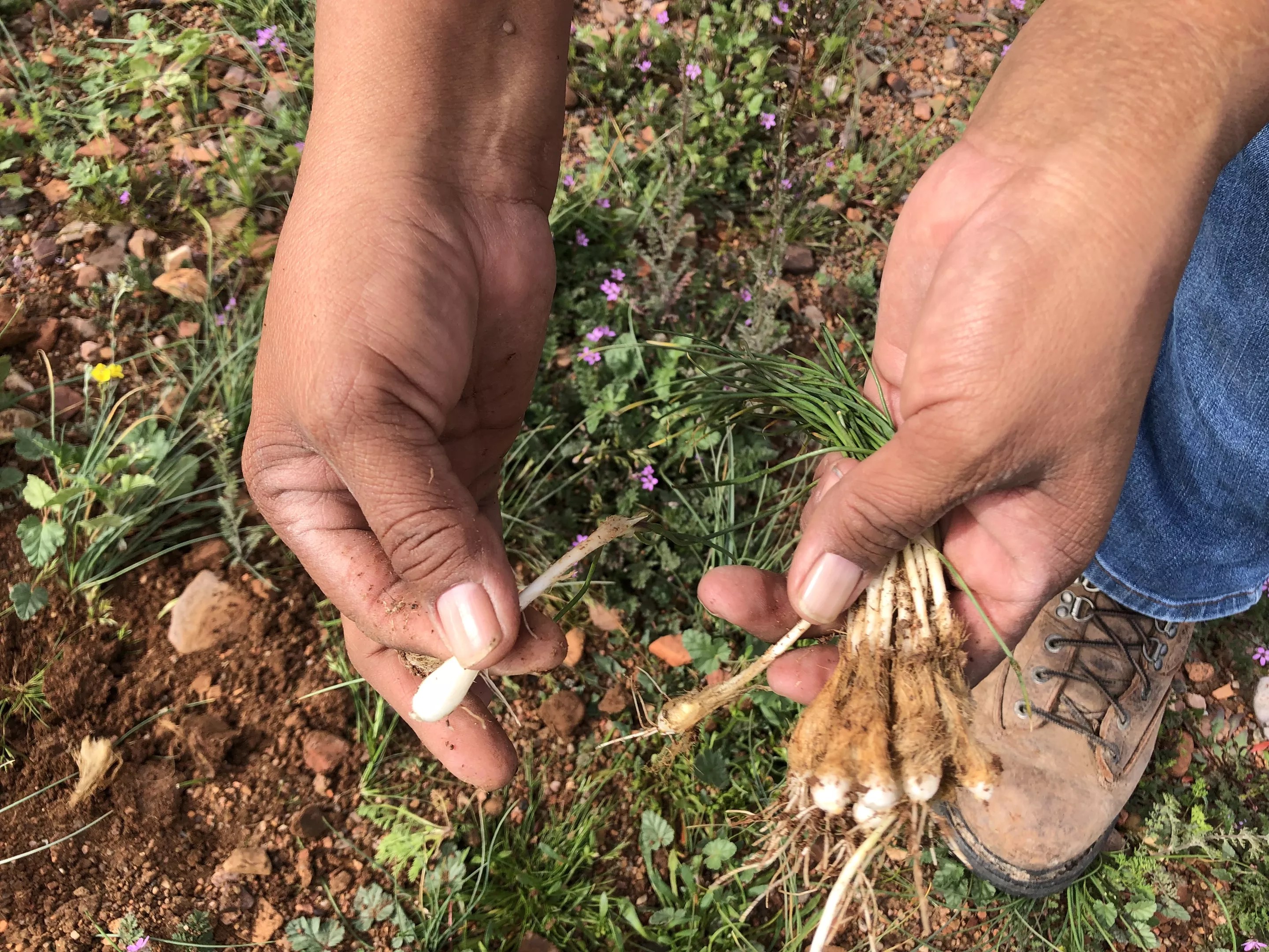 In the soil, she traces a stone around a tuft of onions. Dirt parts as she inscribes a tight circle, a task once done with mesquite branches. It parts the way the ghosts of the past can part for her when searching for the three wild onion species that grow here. Carving deep, she plucks the tuft, each head the size of a small garlic clove.