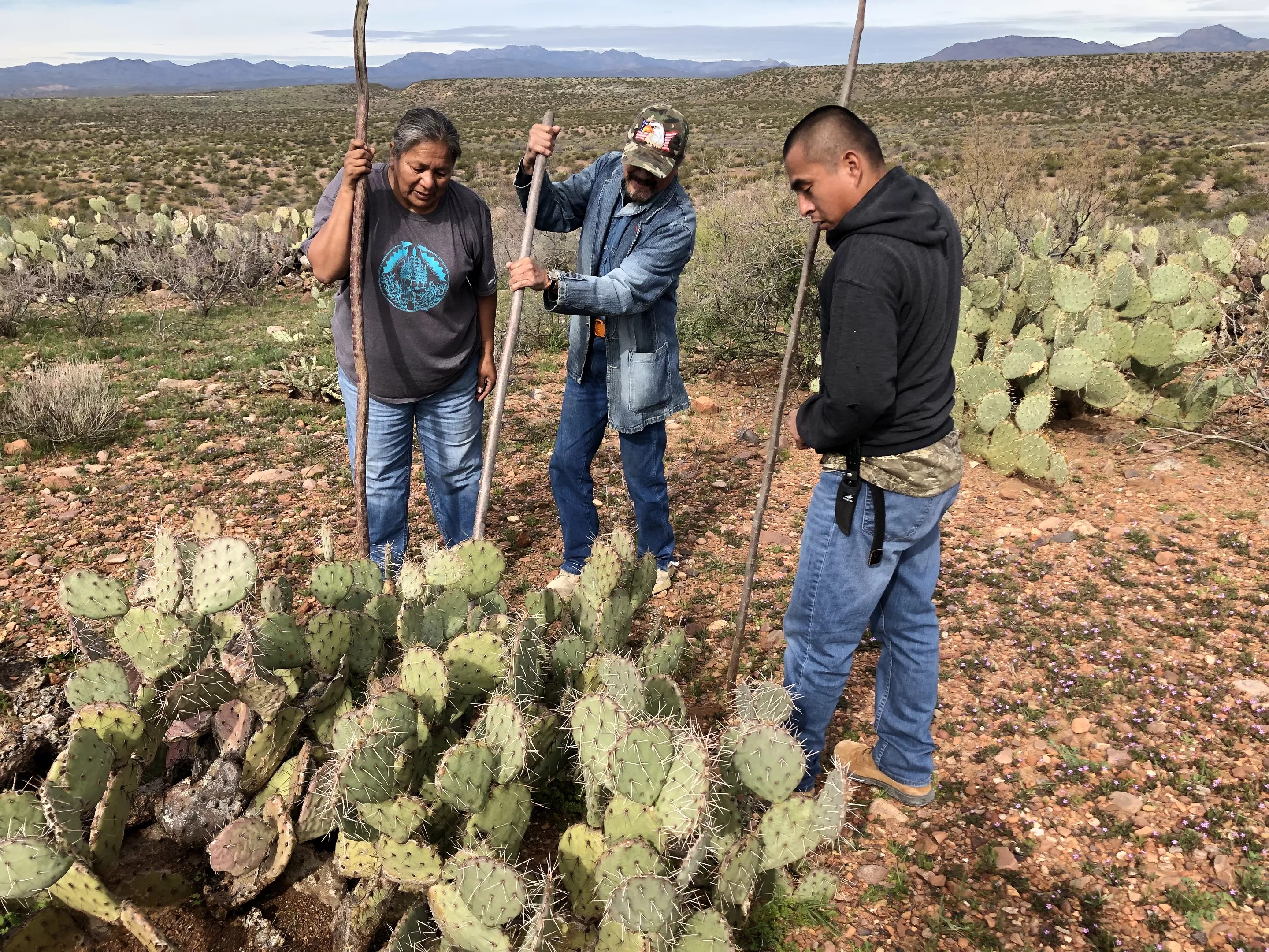 With Cassadore and her cousin joking in Apache, the five start to prod a nest in a massive prickly pear about six feet long. As the hunters work the black rubble around the cactus, the clean smell starts to more resemble soil, moist soil. As the hunters pulp cactus and strike clay, the odor of deep earth infuses the cool morning air, almost like a teabag does hot water.