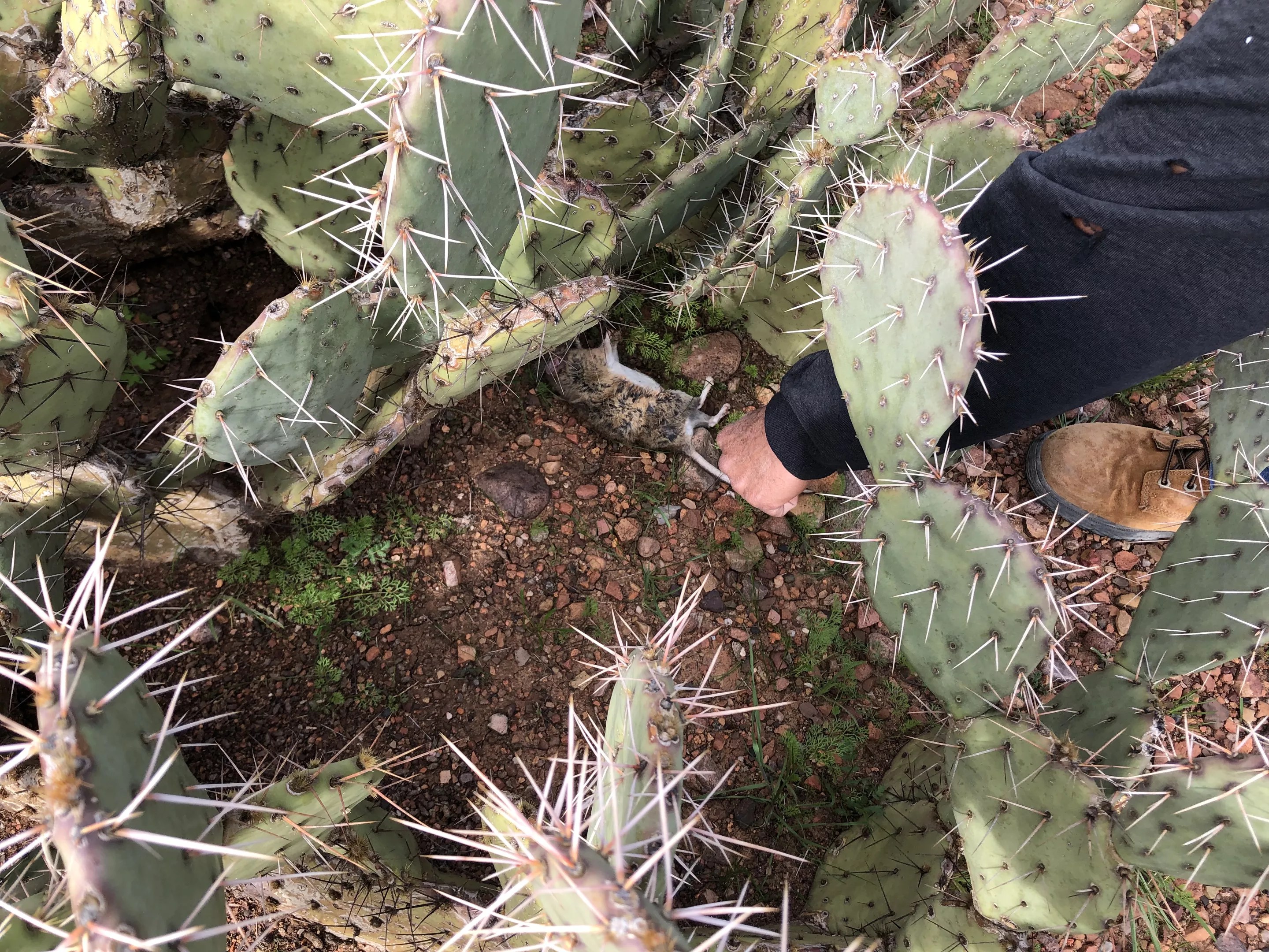 Cassadore stands. She rushes a few dozen feet to the noise. McIntosh issues another truncated cry, thrusting his cedar stick into a nest wrapping a prickly pear, silent as a phantom, looking coiled with speed in his black sweatshirt. Cassadore pokes from the plant’s other side. “I saw him hop almost like a rabbit!” she shouts.