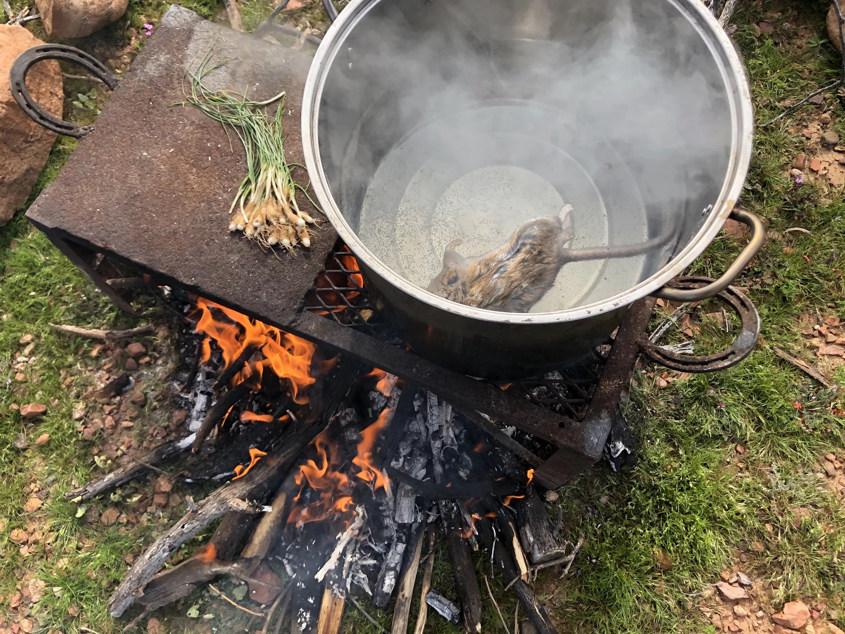 The cook fire is half-ringed with a horseshoe of stones. The flames are healthy, leaping from a pile of salt cedar sticks and cactus parts under a warm midday sun. Flames bathe an iron grate, heating wild onions laid on one half, boiling water on the other, fire licking up the pot sides, turning them matte black.