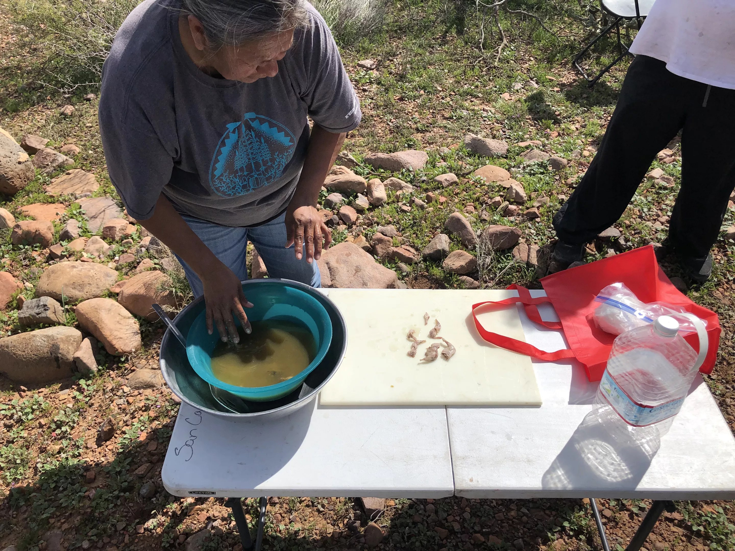 Cassadore pours water into a metal bowl. She transfers the first woodrat to the water. With her fingers, she shimmies off its wet fur, which slips away like a tight coat. She then gently breaks off the head, tosses it aside. As she separates the gloscho into its parts, the clear water turns turgid, the color of ramen broth. The group, now eight after a late arrival, hungrily gathers around.