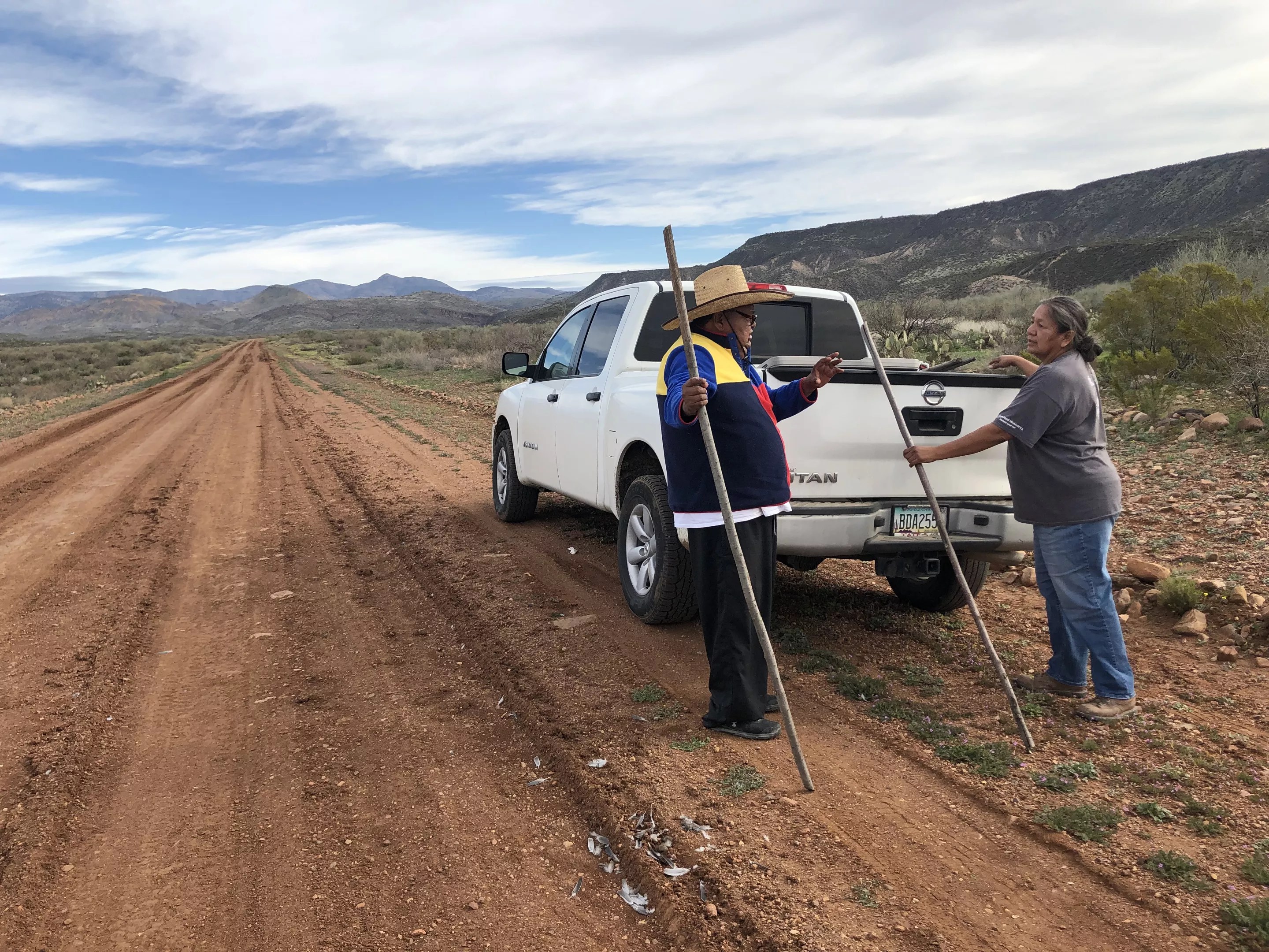 Back on the old dirt wagon road up from the San Carlos River, a truck raises dust.