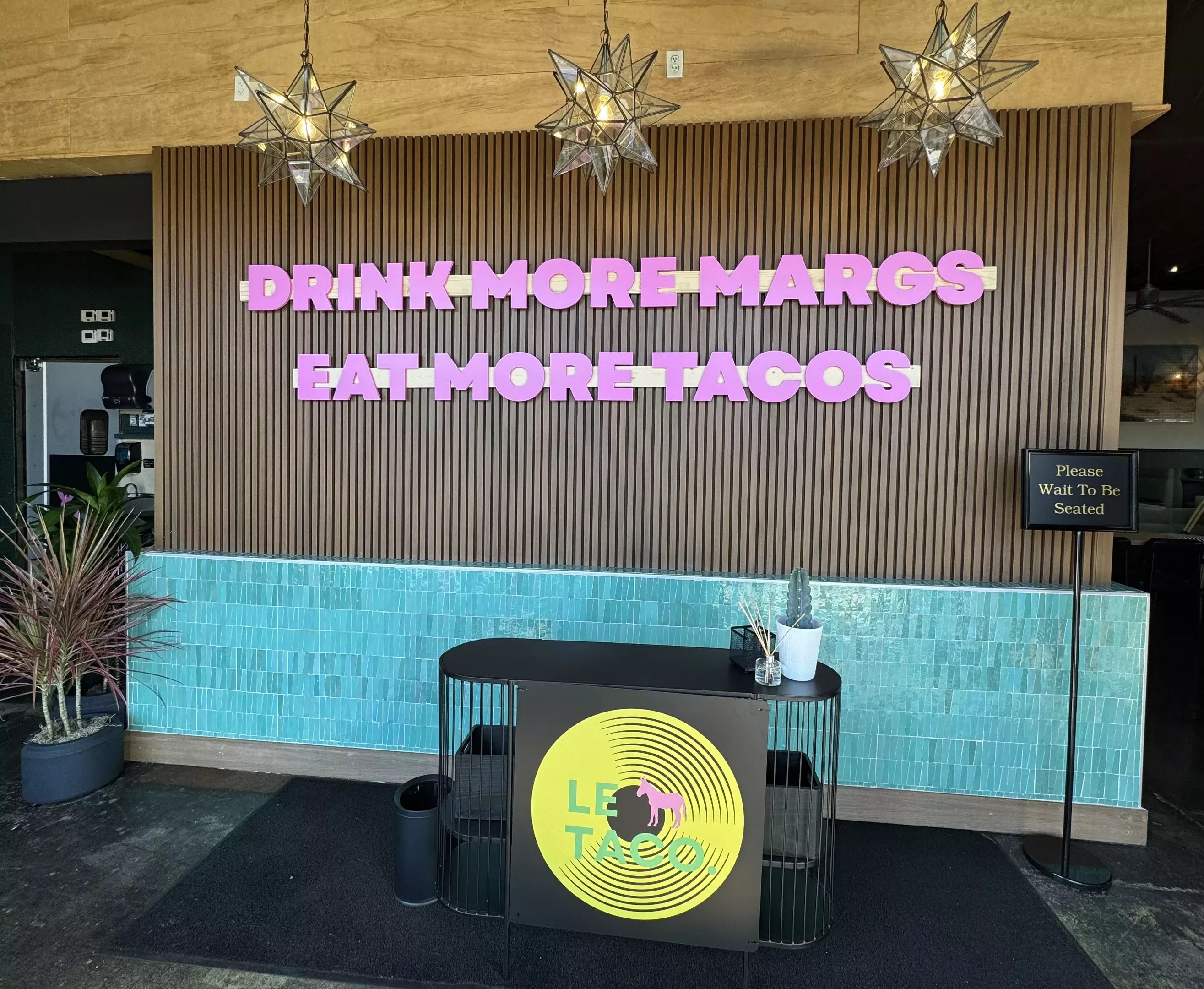 The entry at Le Taco encourages guest to “Drink more margs” and “Eat more tacos.”