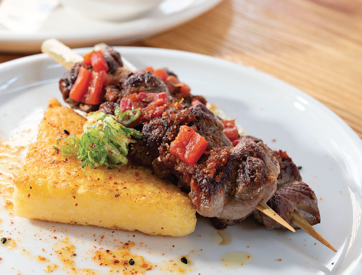 Downtown, the best bite is another creative hybrid: a beef skewer with polenta that has even more going on.