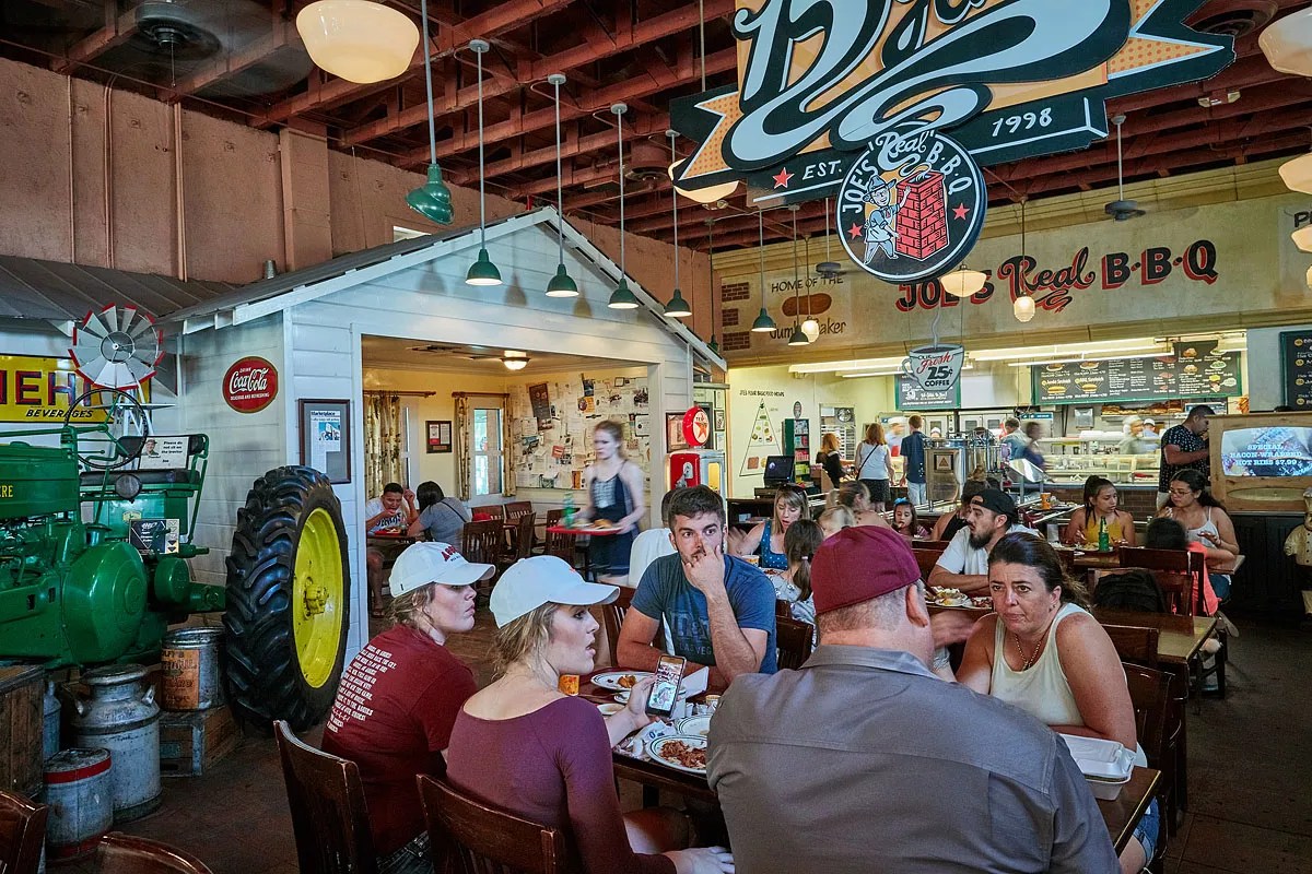A John Deere tractor is the centerpiece of Joe’s Real BBQ’s interior.