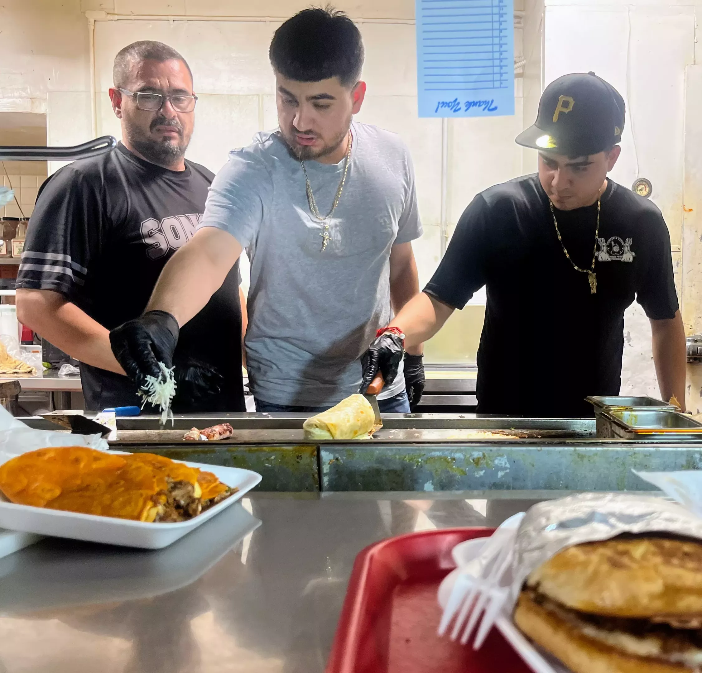 Alex Valenzuela (center) prepares a carne asada papancha, while Yahir Rojas (right) works on an al pastor burrito. Alex’s father, Victor (left), oversees the cooking process.