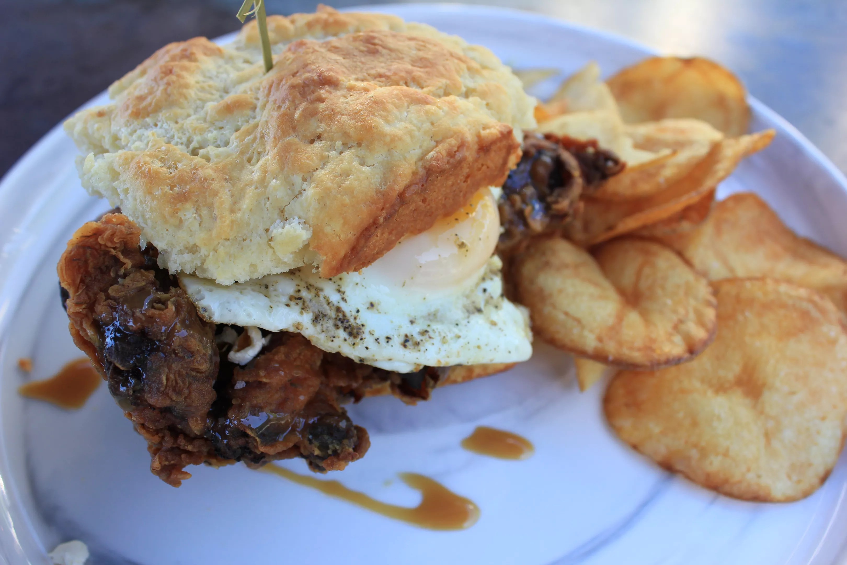 Some have refinements beyond what you see in old-school Southern and soul-style cooking. There’s avocado mousse on a turkey melt. On The Provisionary’s most outlandish and ambitious sandwich – fried chicken topped with a fried egg all served on a biscuit – you will find popcorn and caramel sauce. Sandwiches come alongside crunchy rounds of golden, house-fried chips.