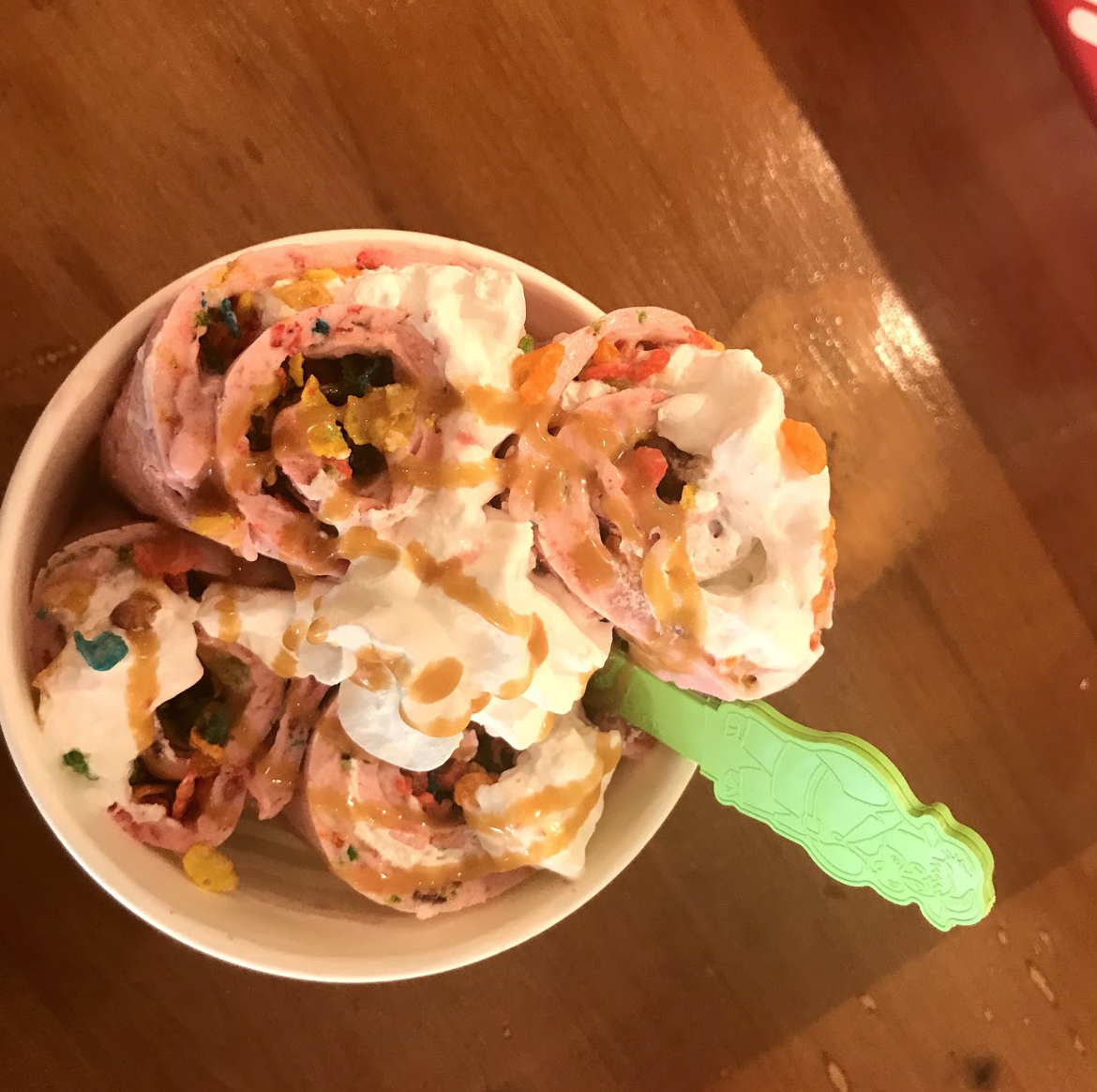 McCurley’s most popular flavor is Snoozberry. For it, he uses strawberry, vanilla, or chocolate ice cream for the base. Strawberries, bananas, and Fruity Pebbles are then mashed into the ice cream to make the flavor. More Fruity Pebbles and whipped cream are added into the middle of the rolls.