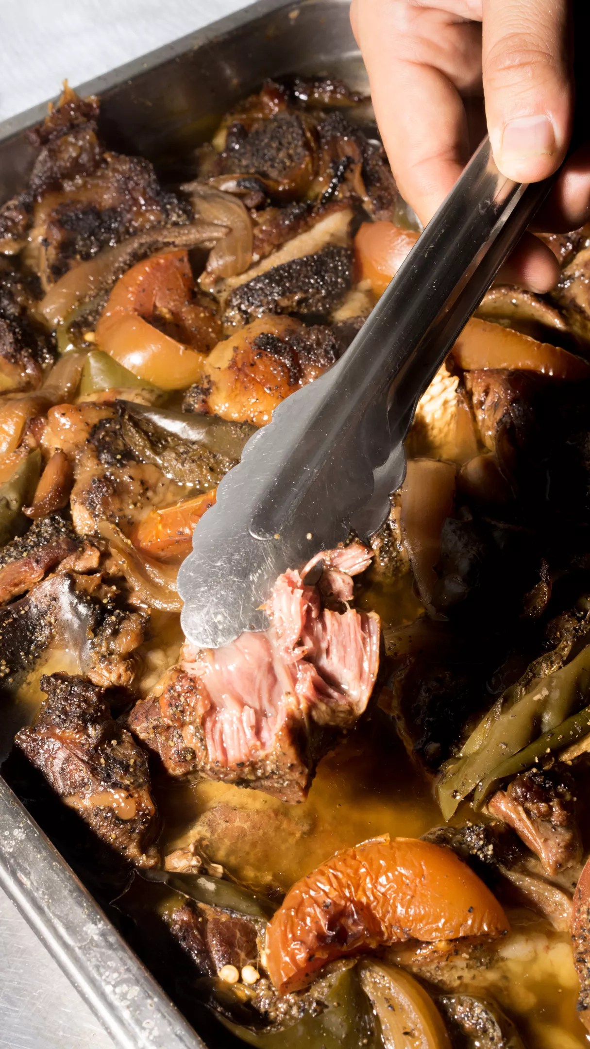 A chunk of beef cheek gets pulled from the roasted veggies and rendered fat that it’s been smoked in for 16 hours.