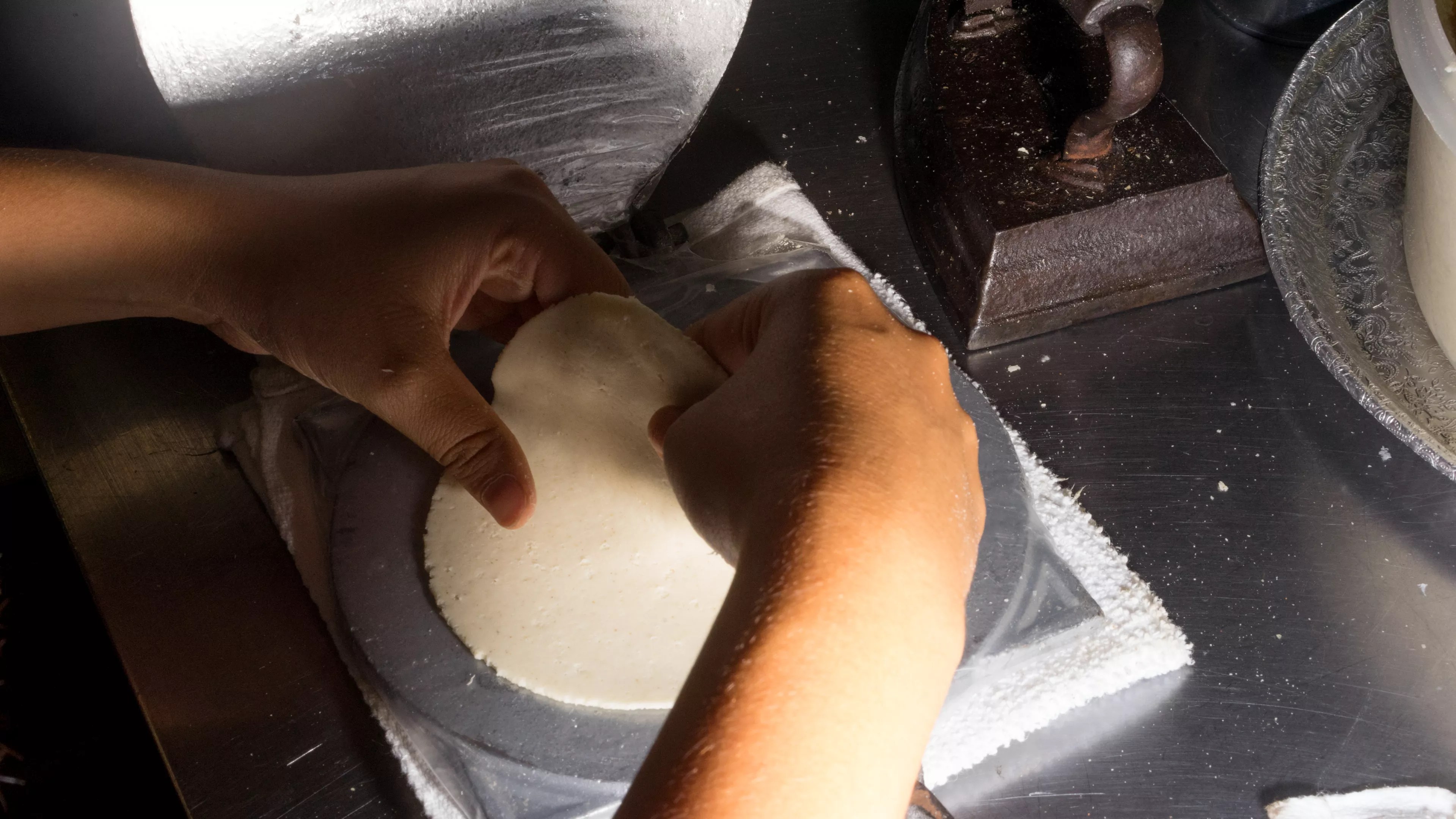 Chef Nadia Holguin presses tortillas, which she’ll cook up briefly on the stovetop.