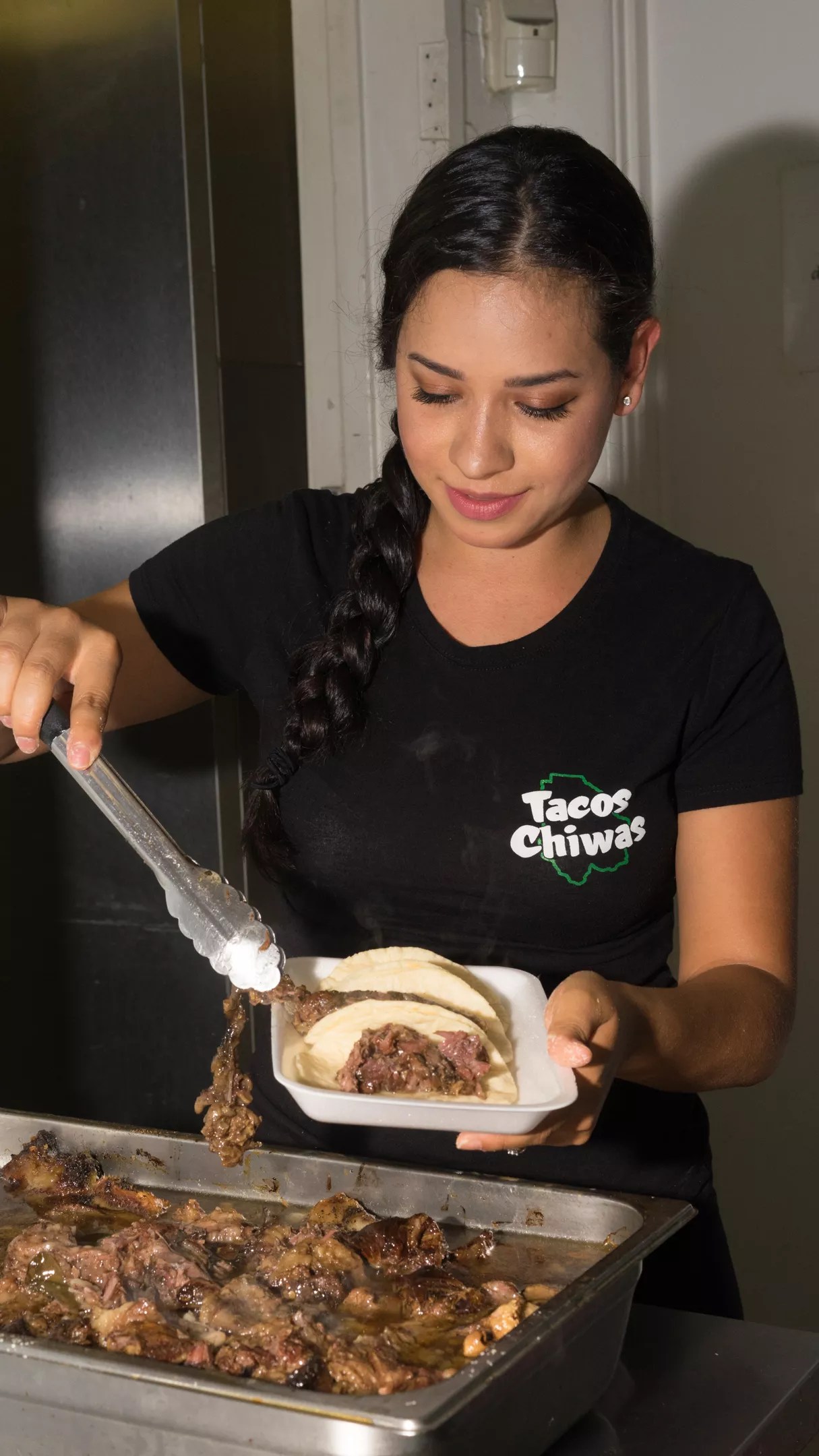 Chef Nadia Holguin loads housemade tortillas up with barbacoa.