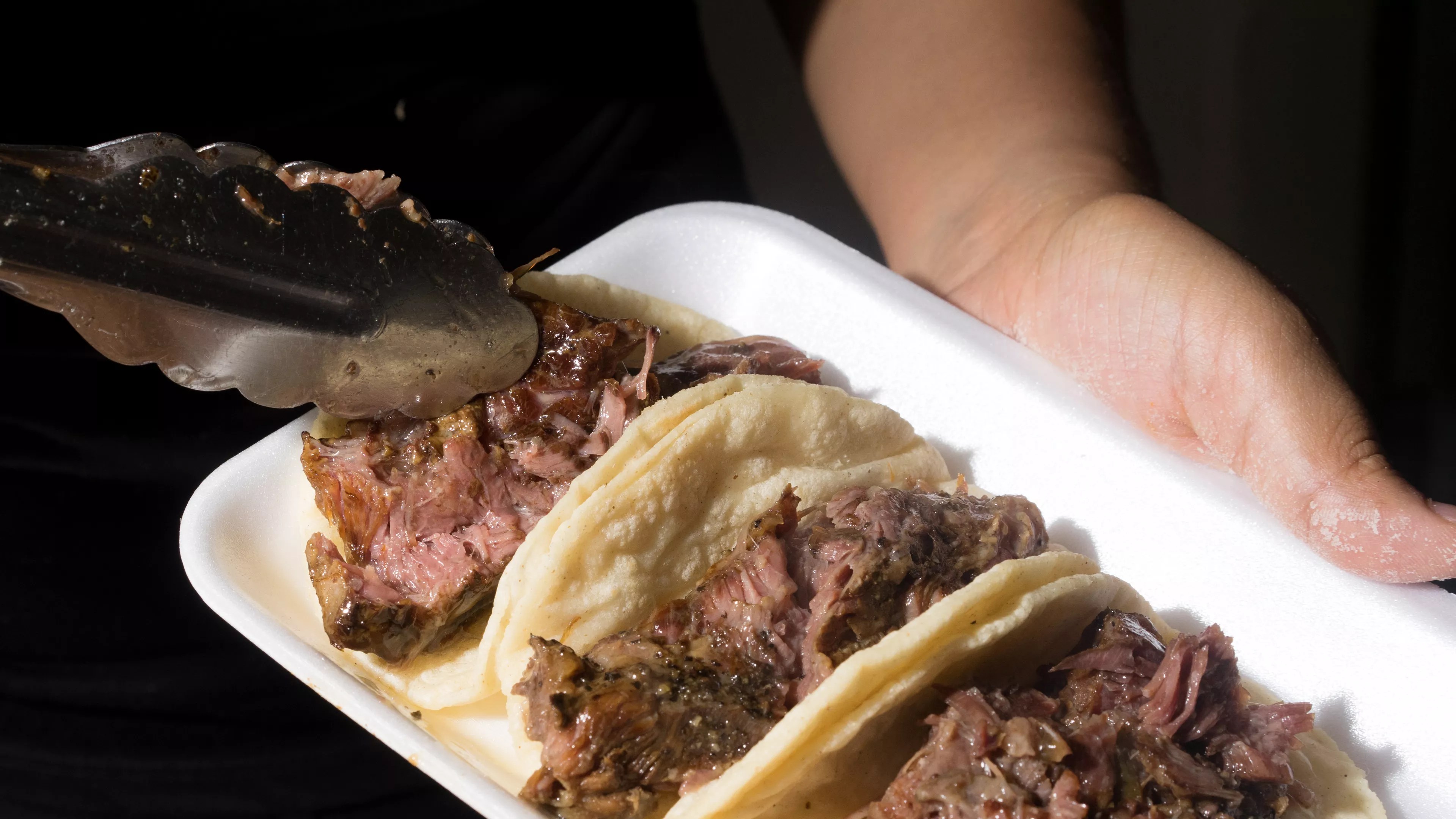 When picked up with tongs and placed into tortillas, Hernandez says that each bite should have mix of large and small chunks of beef, as well as charred edges, which will lend the smokiest flavor.