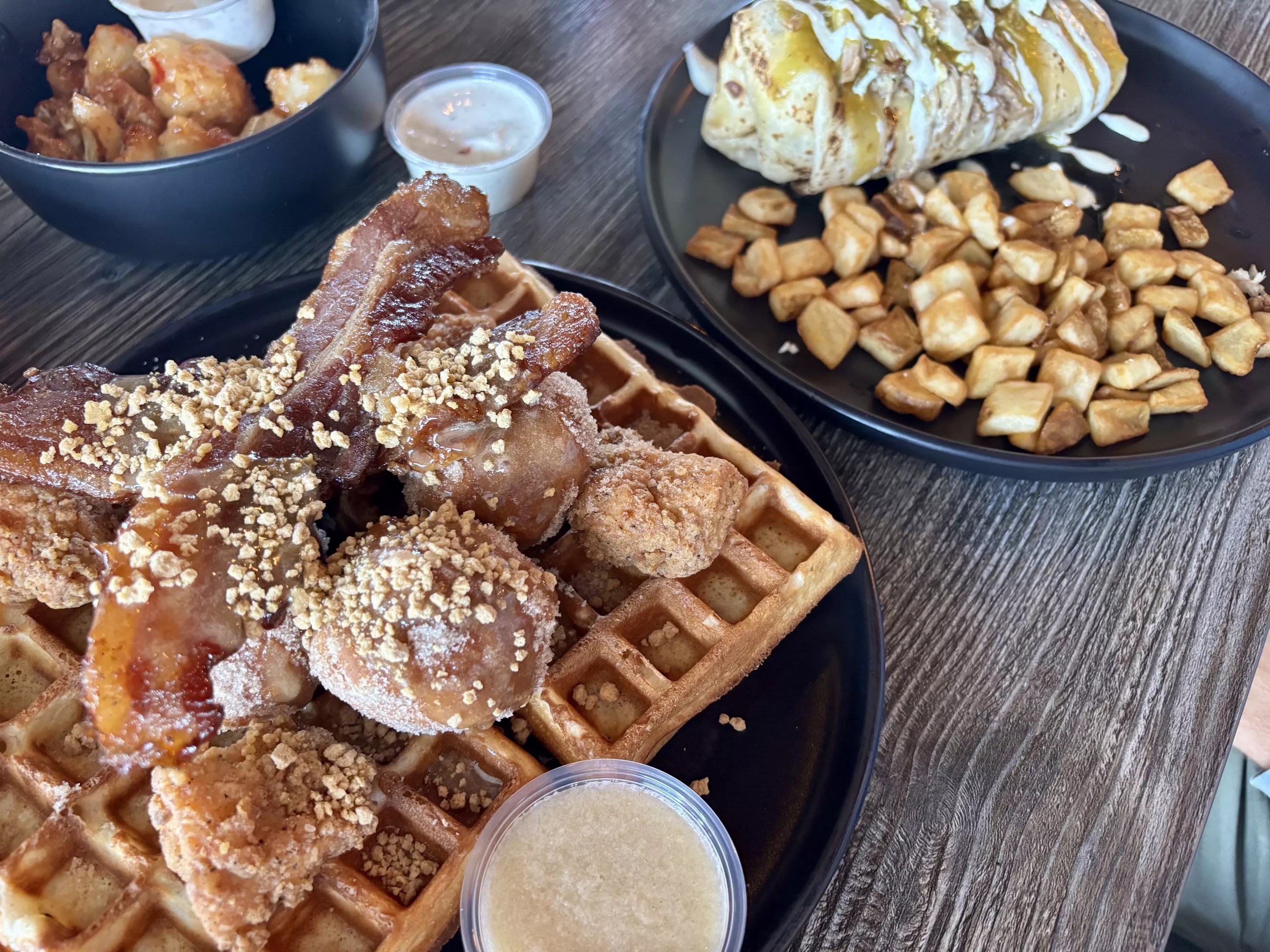 Fluffy waffles come topped with doughnut holes, fried chicken and spicy bacon at Jewel’s.