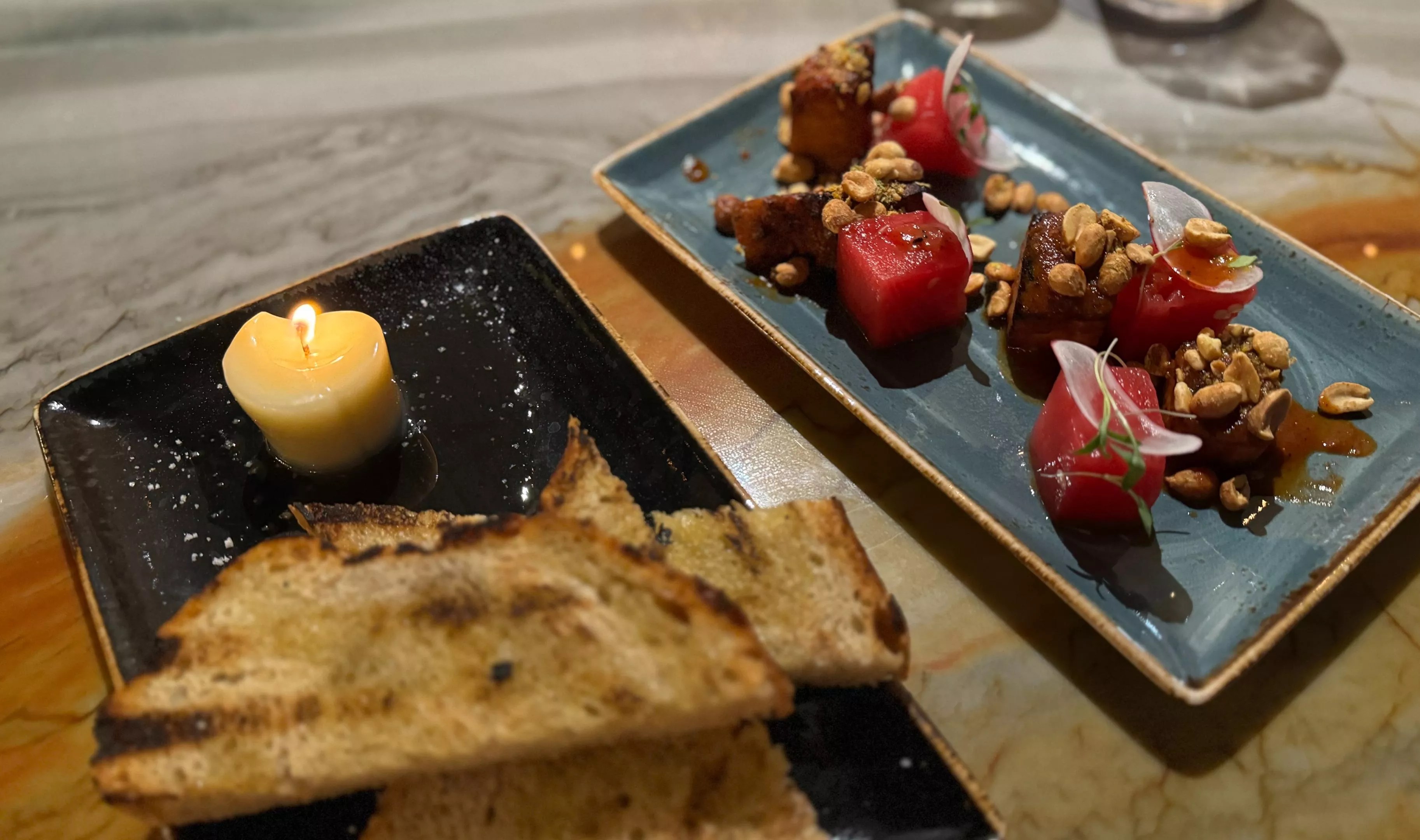 Barley & Smoke, the West Valley’s new speakeasy and chef’s table experience tucked inside Peoria Artisan Brewing, is serving simple, elevated New American fare and craft cocktails in a sleek, stylish setting. The pork belly was our favorite bite from a recent visit. Crisp on the outside, tender on the inside, the cubes of pork belly are paired with similarly sized chunks of lightly tart, sweet cured watermelon and a bright adobo sauce. Salty roasted peanuts add crunch, and peppery splices of radish give the refreshing relief to go back for more.