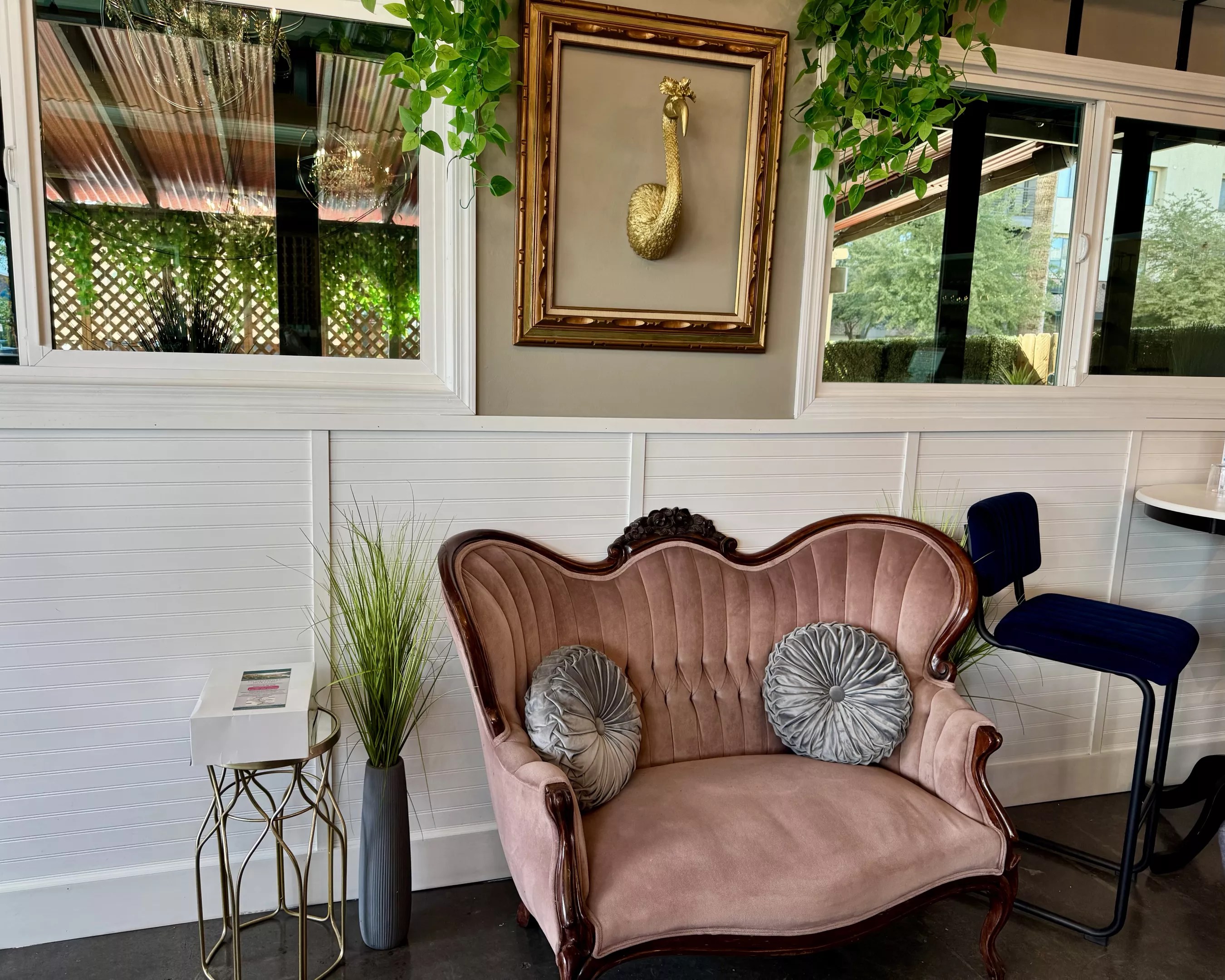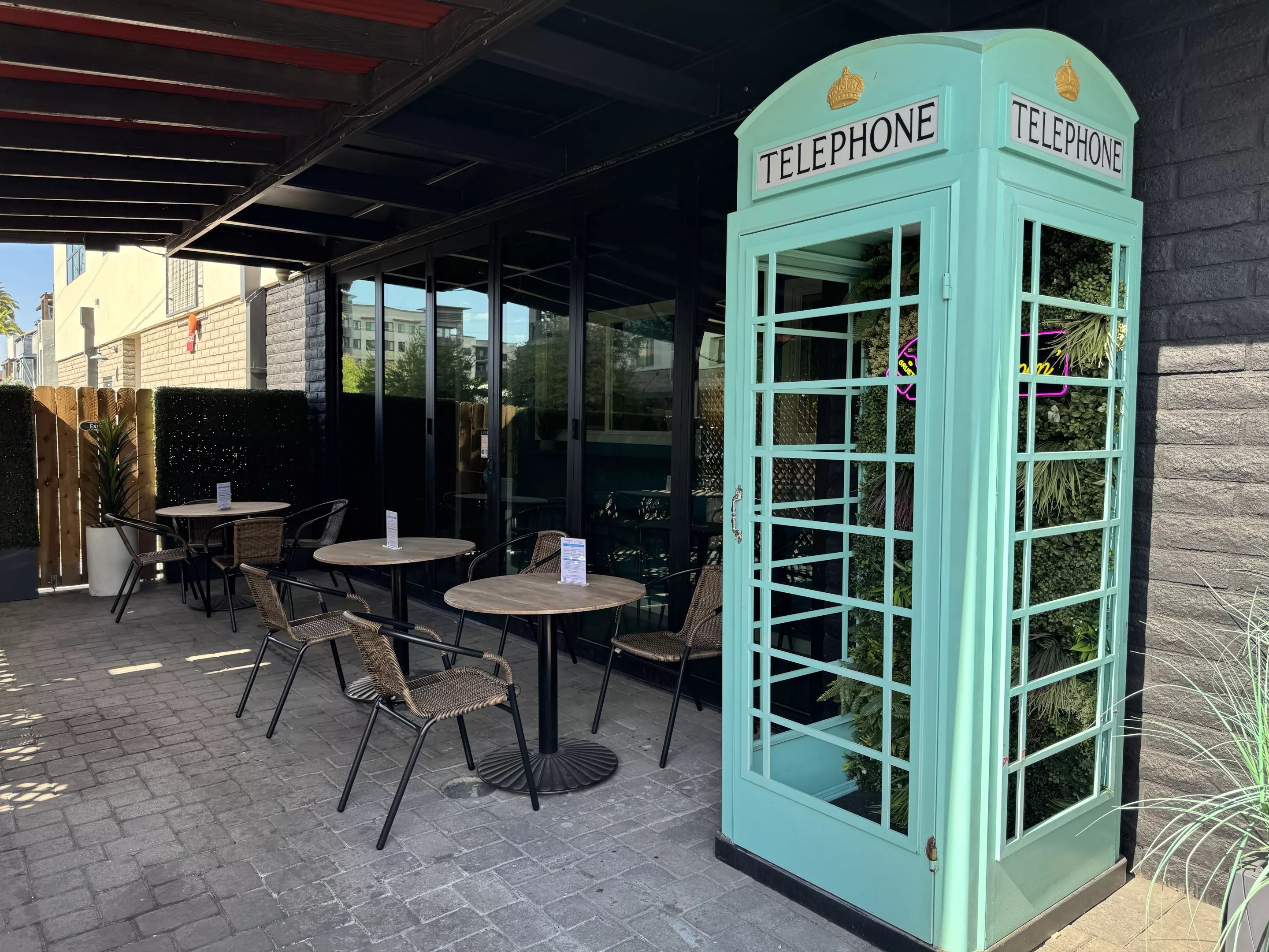 Turquoise’s patio boasts an eye-catching, aqua-painted, vintage telephone booth.