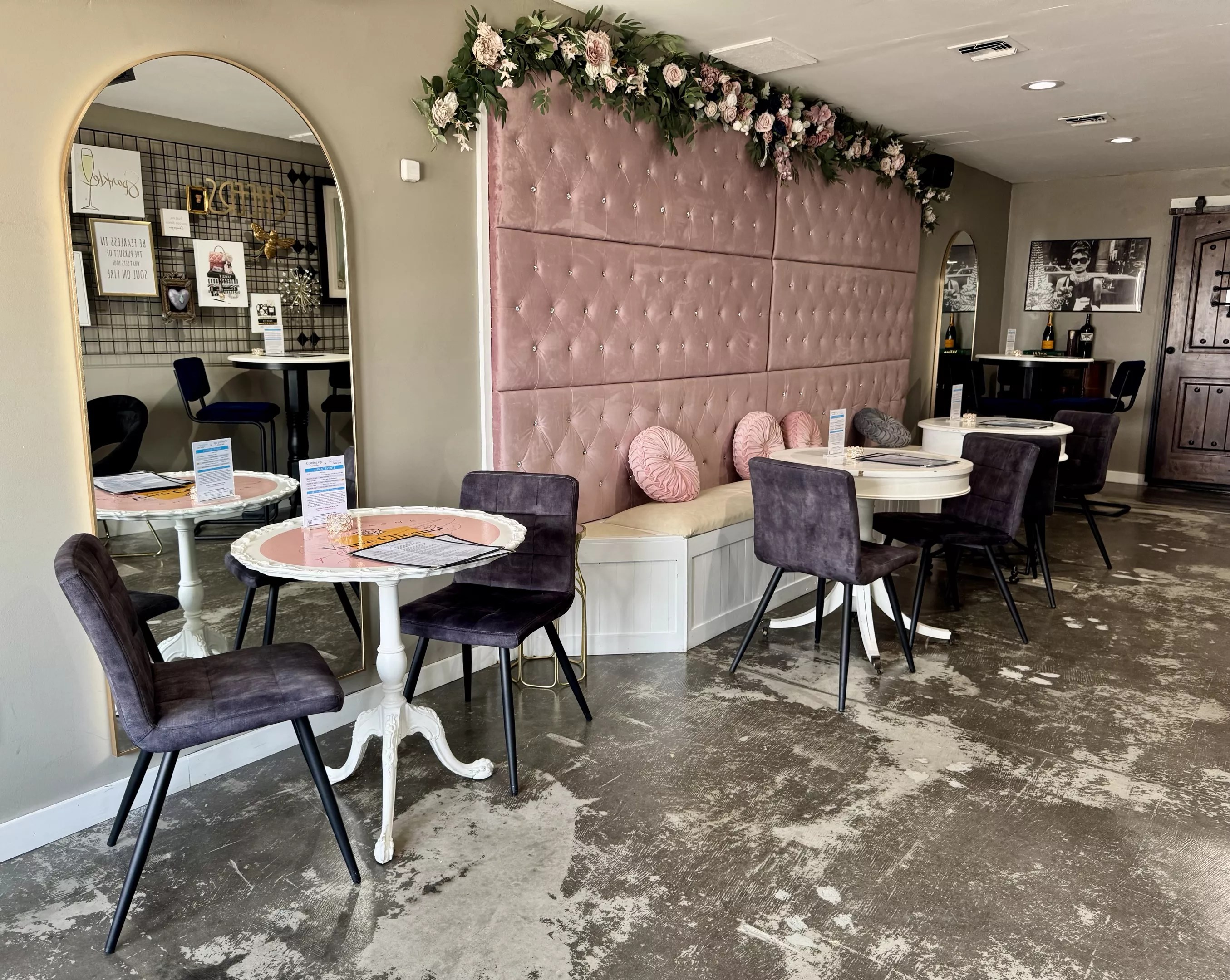 Just off the main room is a Champagne lounge, which will be available for private events. At the lounge’s center is an accent wall of tufted pink panels crowned with faux florals.