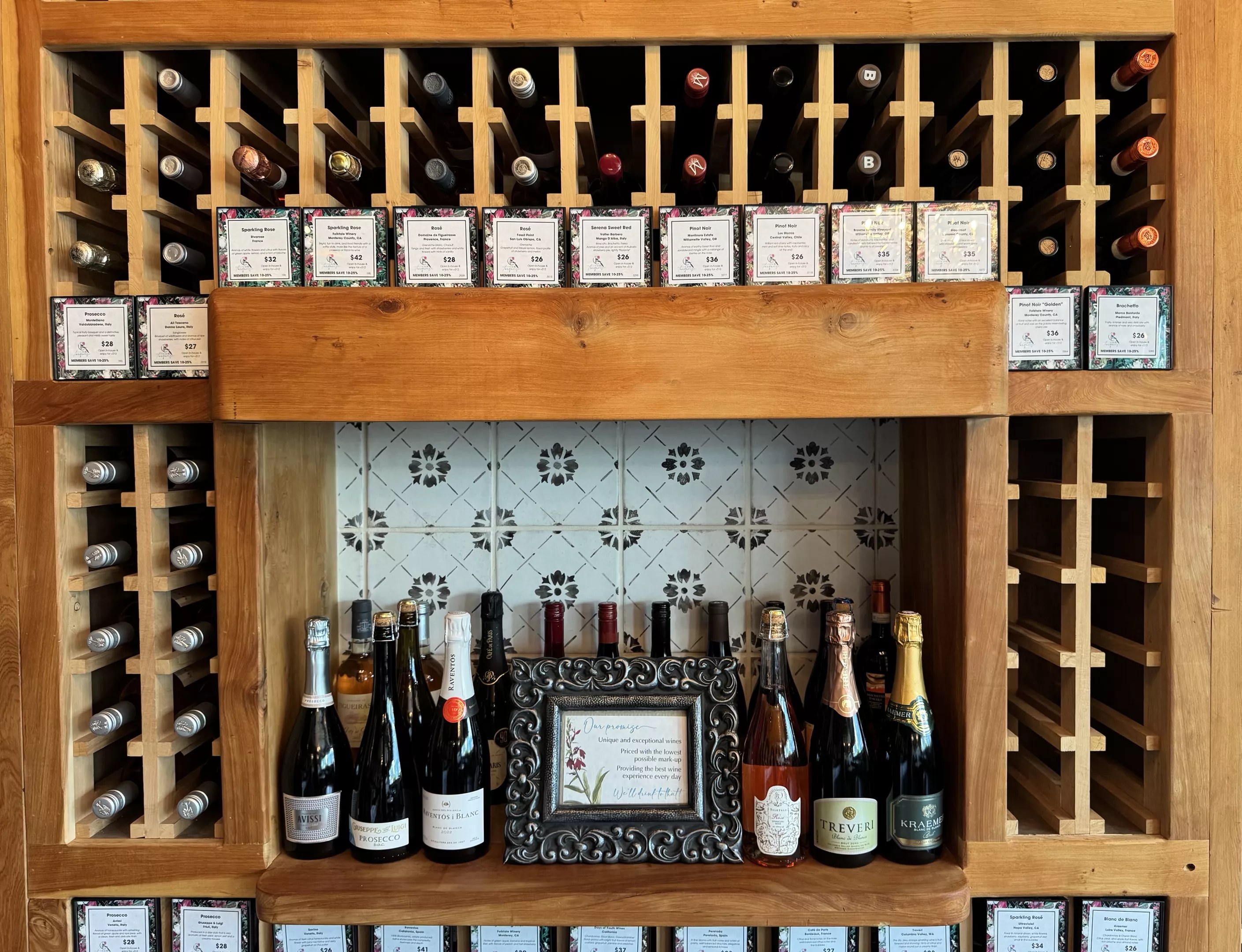 Turquoise’s wine wall holds 600 bottles. Next to each vintage are tasting notes and pricing.