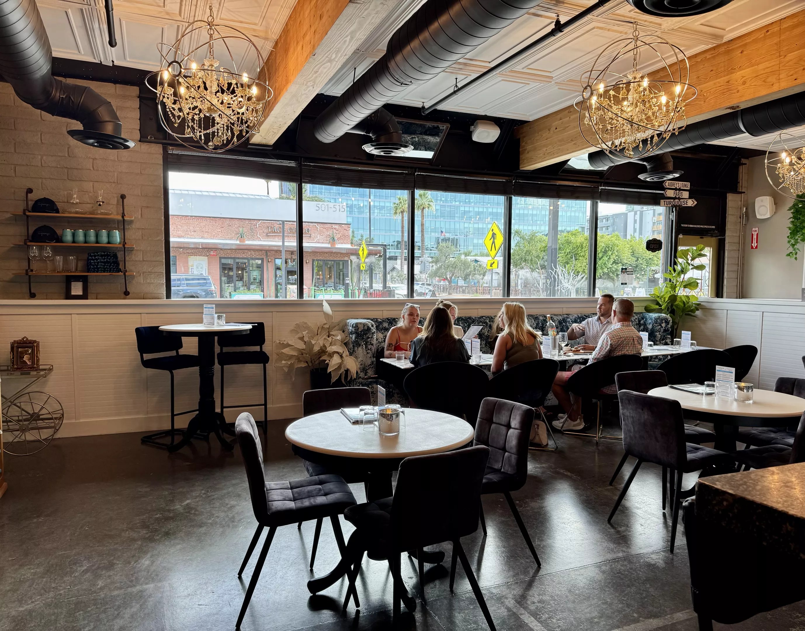 The airy dining room at Turquoise Wine Bar features crystal chandeliers and an expansive blue velvet sofa.
