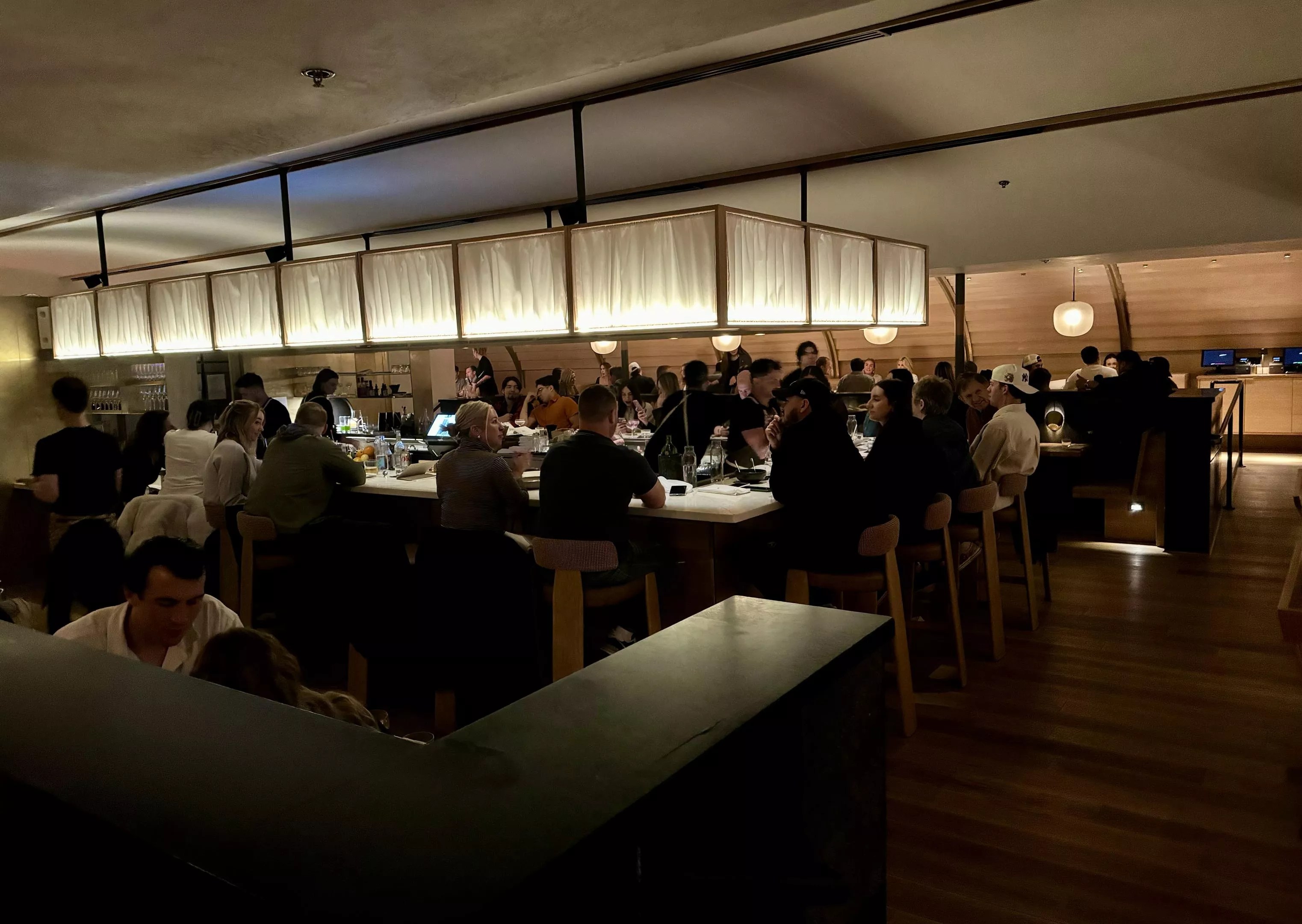 As we walked in, the entry and restaurant were packed. The buzzing space felt alive, yet intimate thanks to cozy curved wood walls and dim, moody lighting.