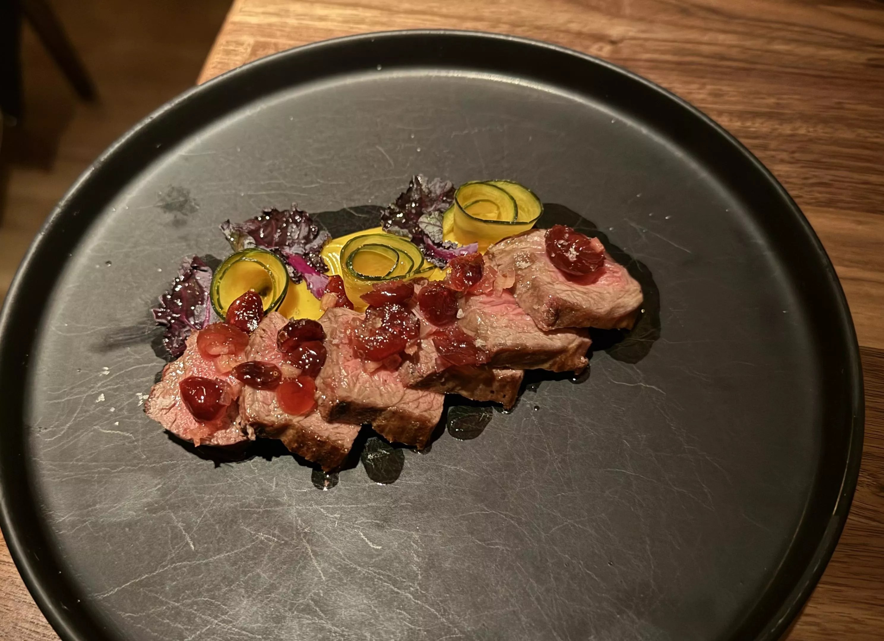 A dish unique to the Scottsdale location of Uchi is a tender and well-seasoned Lamb Sirloin. A side of roasted kabocha squash puree offered a silky, sweet counterpoint and a cranberry-ginger relish added sweet and tart notes. The stars, however, were spicy and bright rolled rosettes of pickled kabocha – we only wished there were more.