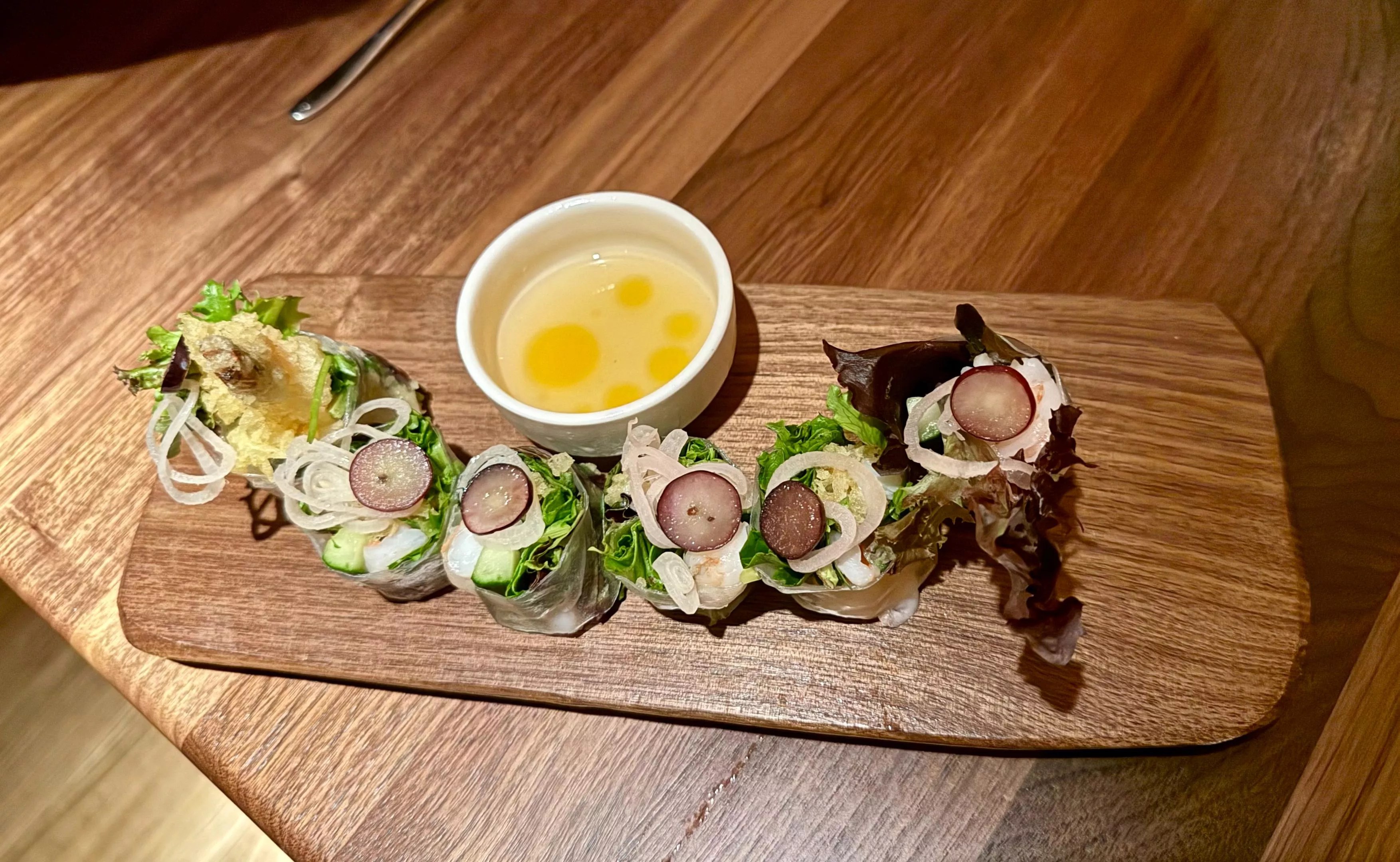 Among the rolls, we opted for Biendo, a tempura shrimp spring roll. It arrived sliced, as a sushi roll would, instead of wrapped as one piece. The roll was topped with slices of grapes and served with a nuoc mam – a salty, citrusy Vietnamese dipping sauce. The Biendo was brimming with chunks of poached and fried shrimp and crunchy fresh vegetables, making for a lighter take on the typical sushi roll.