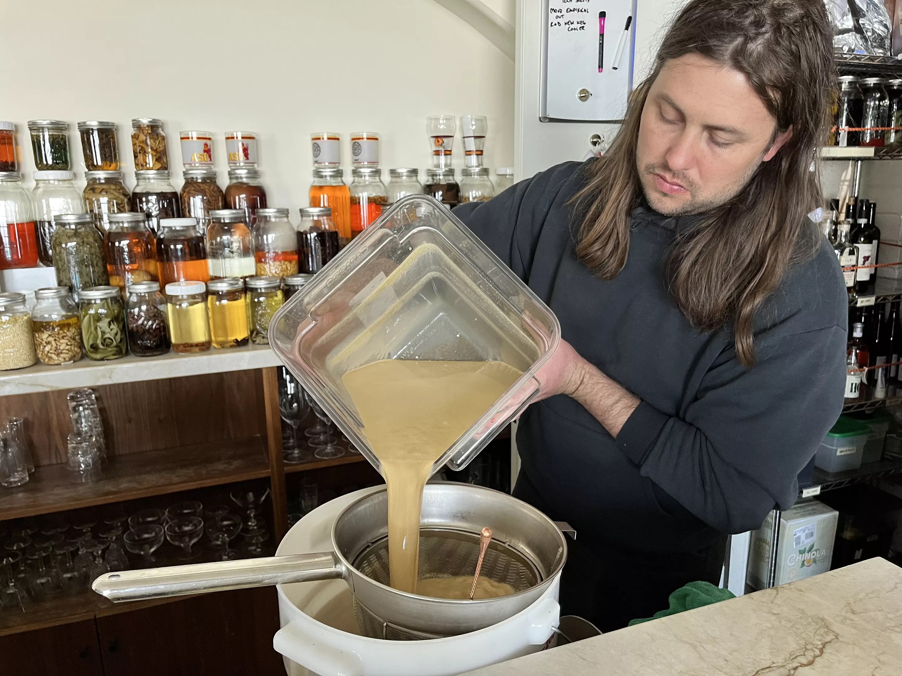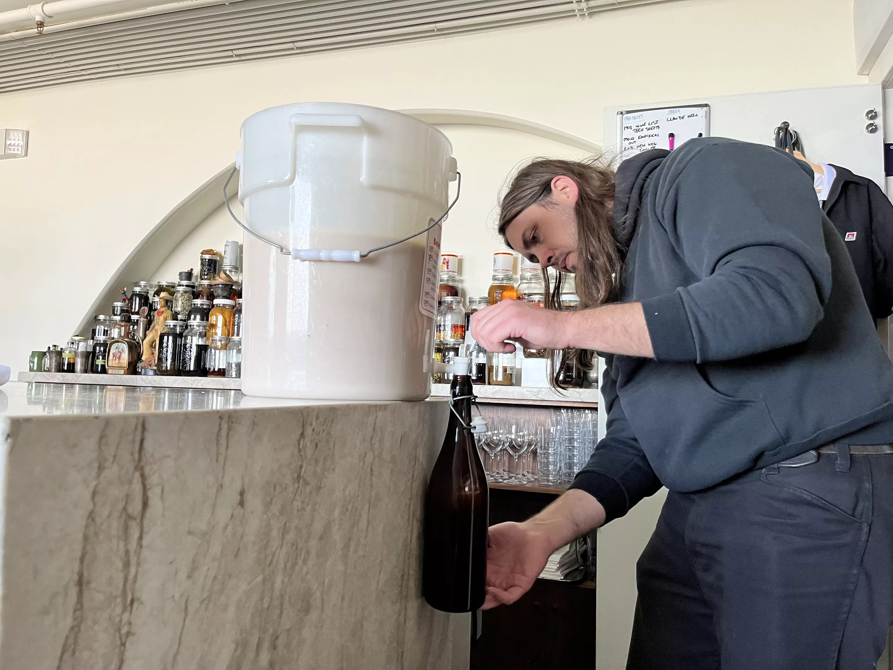 Valentine bar manager Aiden Dunnigan bottles the 12-quart batch that is stored in the refrigerator for the week. “The longer it sits, it’s like it’s aging. It becomes homogeneous and tastes so good,” Dunnigan says.