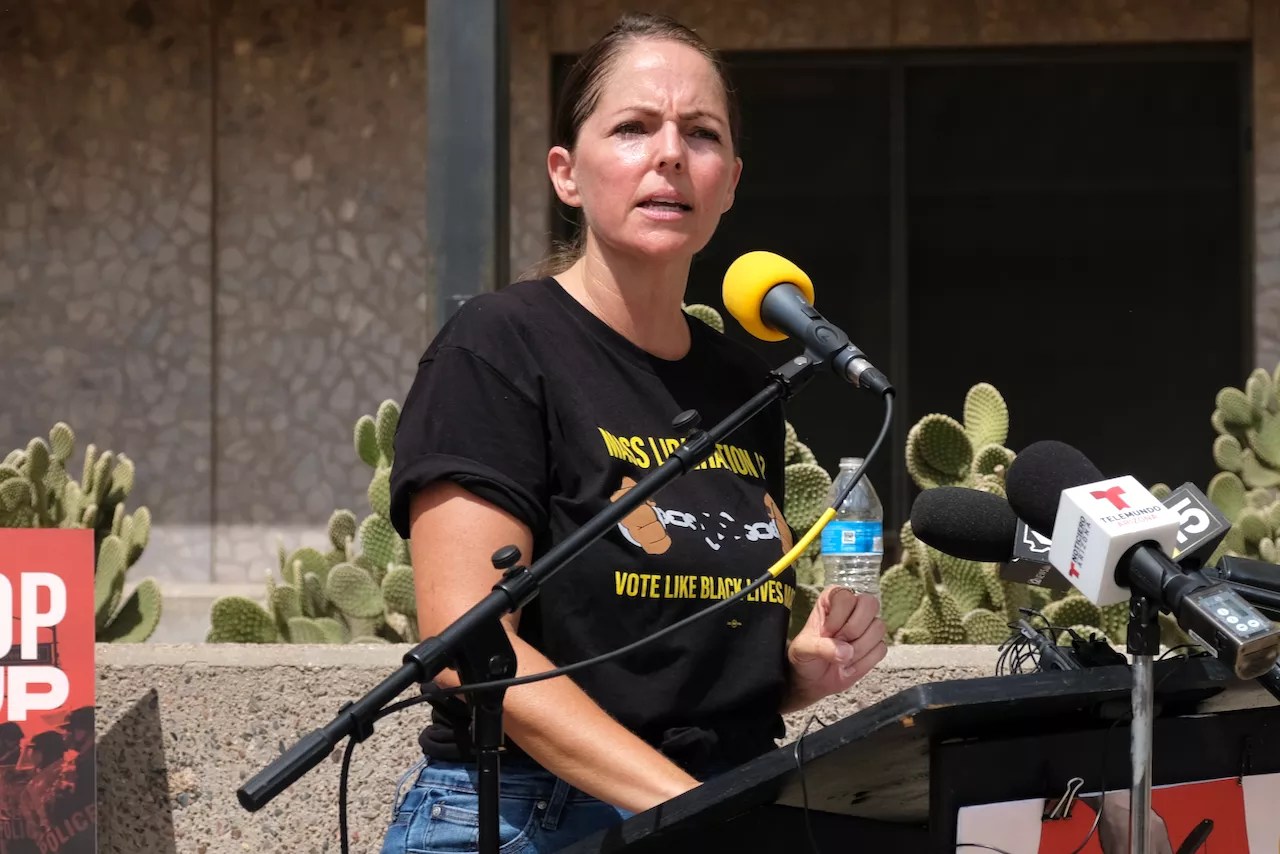 The press event, staged by activist group Mass Liberation Arizona, was held to “celebrate [Williams’] forced retirement,” according to the group. Williams, who became chief in 2016 and announced her retirement in May, has long been a focus for Mass Liberation and other advocates for change in the agency.