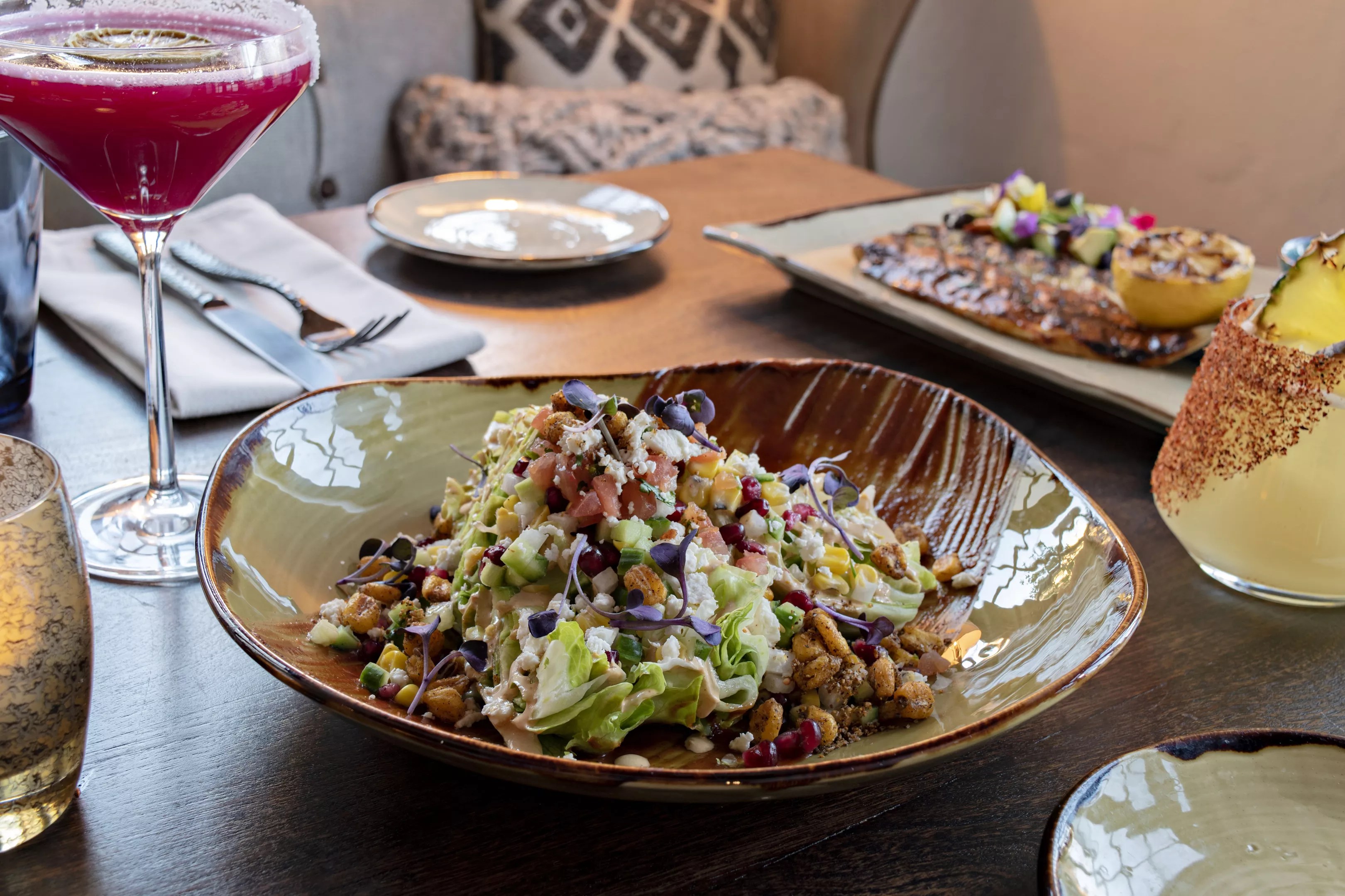 Shrimp and purple octopus – ceviche – rise from a bright, spicy pool. The platter is clean and bracing, though its thin marine liquor may seem more like aguachile than ceviche. Another heady opener is the Mexican wedge, as in the 1980s wedge salad. Piquant, salmon-hued chipotle ranch zags atop romaine segments arrayed centripetally, like sunflower petals. Pomegranate seeds, corn, and queso fresco snowed on like TV static add bursts of color, texture, and flavor. It’s a little too sweet but a lot of fun, especially when your knife rends tight strata of pale lettuce.