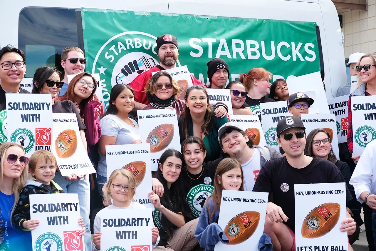 Starbucks workers and NFL Players Association leadership gathered on April 14 in Avondale to raise awareness about the coffee giant’s union-busting tactics.